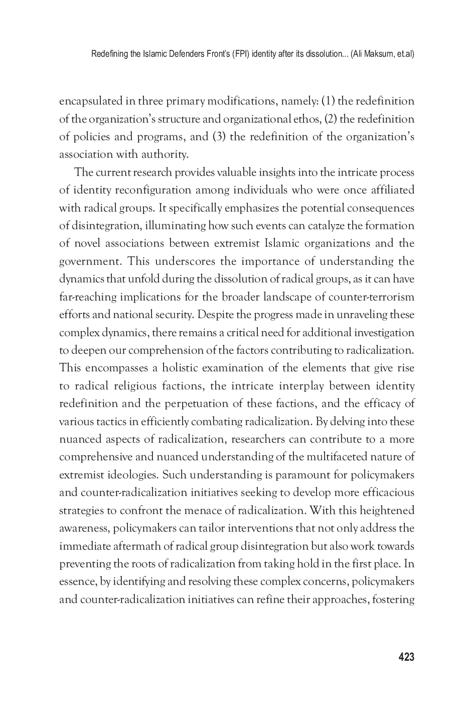 Disbanding radical Islamic groups has been shown to be ineffective to ending their existence and activities.Although the government officially disbanded the FPI, this study demonstrates that the organization is still active and has gone through some changes since its inception.In order to thrive under the restrictive rule of the state, radical organizations pursue a policy of identity redefinition.Since both the governments inattention, and slow response, to poverty, oppression, and immorality, and the congregations ideological indoctrination contribute to the extreme actions of the FPI.It touches upon the issue of normative judgments towards FPI and their role in operationalizing distinctions between identity and ideology.Thus circumstances insist that certain projects be legitimate while others mobilized in the name of religion or culture fall outside the realm of identity politics underscores the inherent state actor subjectivity in these judgments.The FPIs trajectory challenges such normative assertions by showcasing that identitarian movements can be driven by what their members perceive as legitimate cultural and religious rights, inherently linking identity to ideology.