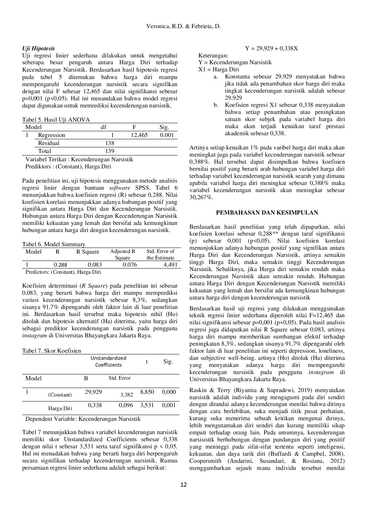 Berdasarkan hasil penelitian, harga diri mampu mempengaruhi kecenderungan narsistik secara signifikan dengan nilai F=12,465 dan p=0,001 (p<0,05).Berdasarkan hasil tersebut dapat disimpulkan bahwa harga diri mampu mempengaruhi kecenderungan narsistik pada mahasiswa pengguna Instagram di Universitas Bhayangkara Jakarta Raya sebesar 8,3%, sedangkan sisanya 91,7% dipengaruhi oleh faktor lain di luar penelitian ini.