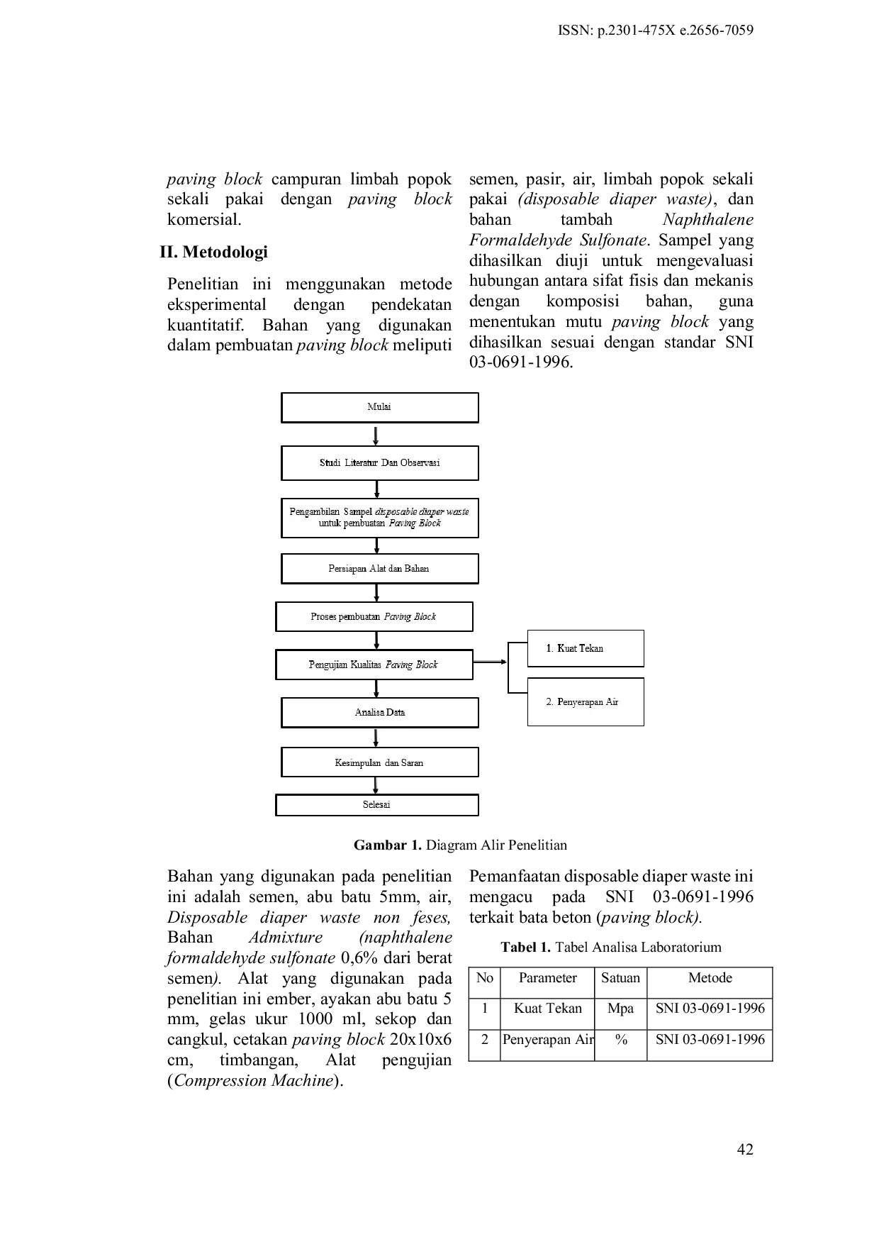 Pelita TeknologiPelita TeknologiStudi ini bertujuan untuk menentukan klasifikasi dan komposisi optimal paving block yang mengandung limbah popok sekali pakai (disposable diaper waste) berdasarkan uji kuat tekan dan penyerapan air sesuai dengan standar SNI 03-0691-1996. Penelitian juga menganalisis pengaruh variasi jumlah limbah popok sekali pakai terhadap uji kuat tekan dan penyerapan air paving block, serta membandingkan kualitas paving block campuran limbah popok sekali pakai dengan paving block komersial.