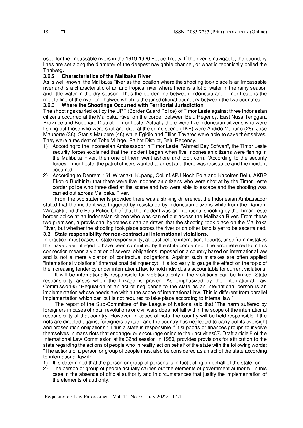 Requisitoire Law EnforcementRequisitoire Law EnforcementDalam penelitian ini, penulis menggunakan metode Normatif Yuridis yang menggunakan data sekunder sebagai bahan utama dalam penyusunan tesis ini dengan teknik Analisis Konten, yaitu data sekunder yang diinterpretasikan dan dihubungkan dengan pendapat ahli hukum untuk memperoleh kesimpulan sehingga diperoleh hasil penelitian yang mendalam dan komprehensif. Berdasarkan hasil penelitian, diperoleh bahwa untuk menyelesaikan sengketa perbatasan antara dua negara dengan menggunakan rekonsiliasi antara kedua negara dengan membentuk komisi rekonsiliasi untuk jangka waktu tiga bulan untuk memperoleh hasil tentang penyebab sengketa perbatasan yang disebabkan oleh penembakan terhadap warga negara Indonesia. Rekonsiliasi ini bertujuan untuk memberikan mandat atau perintah kepada komisi rekonsiliasi tentang siapa yang bertanggung jawab atas penembakan dan kemudian memberikan cara untuk menentukan batas wilayah antara kedua negara. Cara kedua adalah dengan menggunakan Penyelidikan yang melibatkan tim independen, hasilnya akan dipublikasikan untuk tindakan lebih lanjut. Langkah selanjutnya adalah menggunakan Arbitrase yang bersifat publik jika kedua metode di atas tidak mampu mengatasi masalah. Arbitrase yang dimaksud adalah semi-pengadilan untuk mengadili pelaku penembakan serta menetapkan batas wilayah yang jelas antara kedua negara agar di masa depan sengketa yang sama tidak terjadi. Upaya yang dapat dilakukan oleh Indonesia untuk mewujudkan keadilan bagi korban penembakan adalah dengan mengajukan nota protes yang kuat terhadap kasus penembakan ini dan menjelaskan kejadian kepada Timor Leste jika tidak mendapat tanggapan yang baik adalah dengan mengakhiri hubungan diplomatik karena sifat berbahaya dari aksi penembakan terhadap perdamaian di wilayah perbatasan. Langkah selanjutnya adalah dengan pengadilan lokal bagi penembak di yurisdiksi Timor Leste. Ini adalah cara efektif untuk menyelesaikan sengketa perbatasan tanpa melakukan kekerasan.