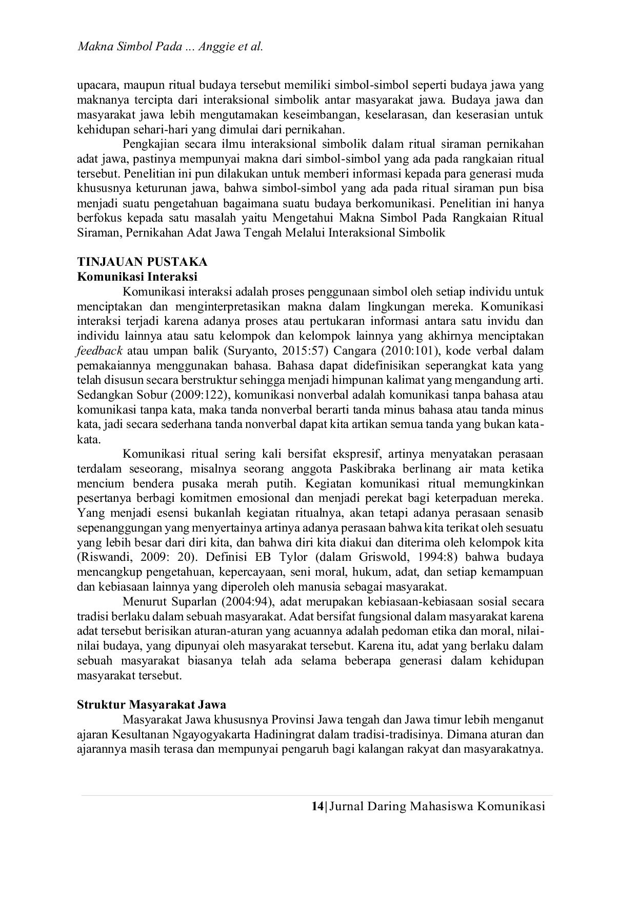 JURNAL DARING MAHASISWA KOMUNIKASIJURNAL DARING MAHASISWA KOMUNIKASIPenelitian ini bertujuan untuk mengetahui makna dari simbol yang ada pada ritual siraman pernikahan adat Jawa tengah. Jenis penelitian ini adalah kualitatif dengan studi analisis interaksional simbolik. Sumber data yang penulis gunakan dalam penelitian ini berasal dari informan, key informan, serta dokumen yang berupa foto-foto dari ritual siraman. Pengumpulan data dapat dilakukan dengan menggunakan teknik wawancara, observasi non partisipan dan dokumentasi. Masyarakat Jawa berinteraksi menggunakan simbol sejak zaman dahulu kala. Dimana pada simbol tersebut terdapat makna baik yang tersembunyi sekaligus bermanfaat bagi yang mempercayai. Dalam proses interaksi pun terdapat banyak simbol dalam bentuk verbal dan nonverbal. Simbol secara tidak sadar dan tidak langsung sering kita temui dalam kehidupan sehari-hari maupun dalam kegiatan resmi, seperti ritual dalam pernikahan. Salah satu ritual dalam pernikahan yang kental dengan adat istiadatnya dan terdapat banyak simbol didalamnya ialah ritual siraman. Legenda Raden Panji dan Dewi Chandrakirana dari kerajaan Kediri adalah asal mula terjadinya ritual siraman dalam salah satu rangkaian ritual pernikahan adat Jawa tengah. Dalam rangkaian ritual siraman adat Jawa sudah dipastikan terdapat banyak simbol serta pesan verbal dan nonverbal. Simbol tersebut dapat berupa alat-alat siraman, sesaji siraman, pakaian siraman dan aturan siraman. Pesan verbal dalam ritual siraman lebih banyak menggunakan bahasa Jawa kajawen, sedangkan pesan nonverbal lebih banyak terjadi saat pelaku komunikasi dalam ritual siraman ini berinteraksi, seperti pada saat sungkeman, siraman, potong rikma dan jualan dawet. Makna simbol, pesan verbal dan pesan nonverbal masing-masing mempunyai makna yang wajib dan penting untuk diketahui oleh masyarakat Jawa yang melaksanakan ritual siraman. Makna dari alat-alat siraman, sesaji siraman, pakaian siraman dan aturan siraman dipercaya membawa dampak baik bagi kehidupan baru yang akan dijalankan pasangan pengantin. Salah satunya seperti simbol air dari 7 sumber berbeda maknanya ialah agar kelak setelah sah menjadi pasangan pengantin kehidupan barunya diberi kebahagiaan dan tentram hati, lalu simbol dari sesaji yaitu tumpeng robyong yang maknanya ialah kehidupan pasangan pengantin yang melaksanakan ritual siraman ditingkatkan derajatnya dan diberi keselamatan. Melaksanakan ritual siraman sebelum ijab qobul, artinya kita ikut melestrasikan dan mempertahankan budaya Jawa. Dimana kita ketahui budaya Jawa sangat khas dengan ritual adatnya.