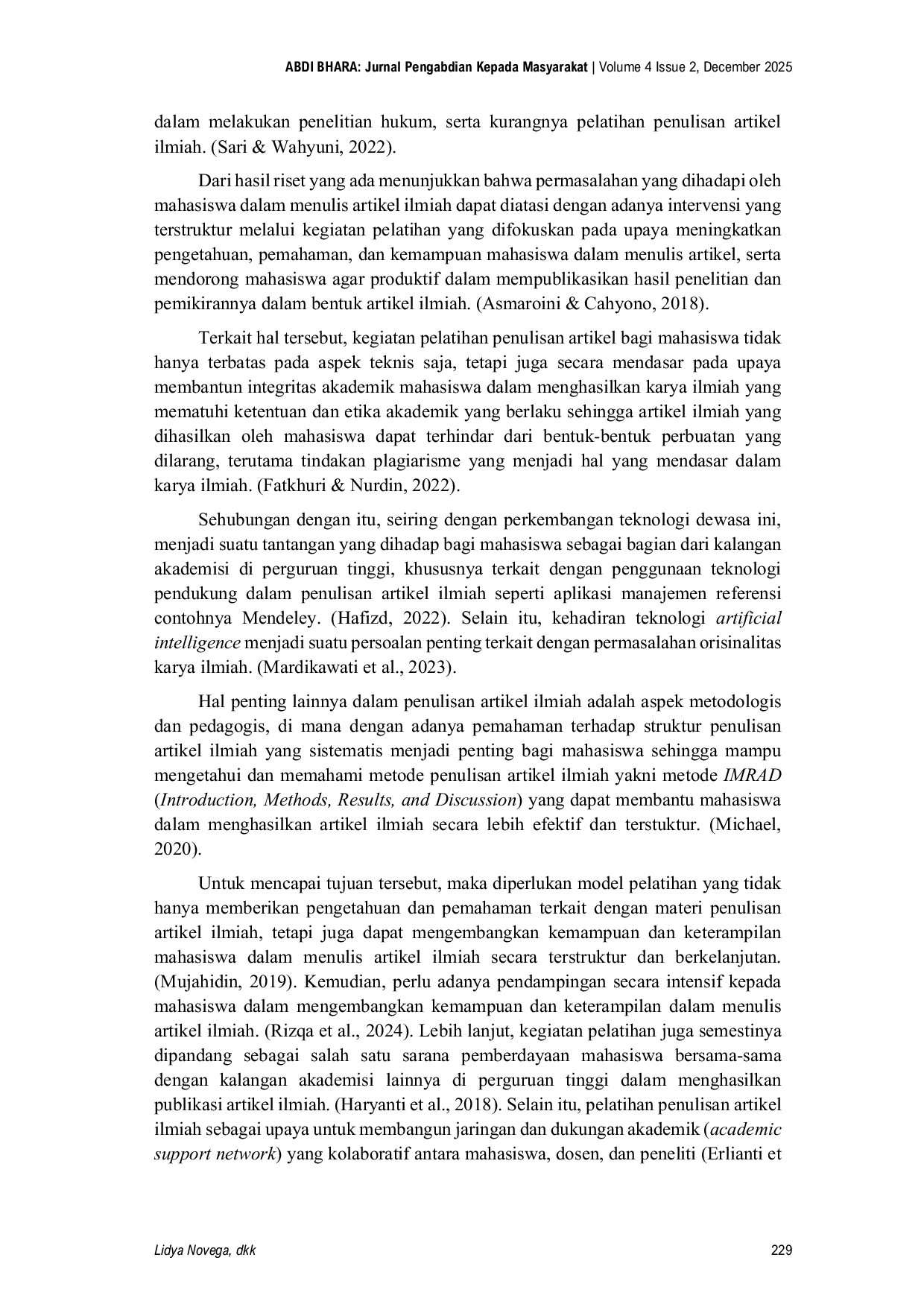 Abdi BharaAbdi BharaPelatihan penulisan artikel ilmiah merupakan salah satu strategi penting dalam meningkatkan kualitas akademik mahasiswa, khususnya di lingkungan Fakultas Hukum, di mana dalam konteks pendidikan tinggi, mahasiswa tidak hanya dituntut memahami teori dan praktik hukum, tetapi juga harus mampu menuangkan pemikirannya secara tertulis dalam bentuk karya ilmiah yang berkualitas. Namun kenyataannya, masih banyak mahasiswa yang belum memiliki pemahaman dan keterampilan memadai dalam menyusun artikel ilmiah sesuai standar akademik dan etika penulisan hukum sehingga menjadi penting untuk mengadakan pelatihan penulisan artikel kepada mahasiswa. Pelatihan dirancang untuk membekali mahasiswa dengan pemahaman mengenai struktur artikel ilmiah hukum, dimulai dari pemilihan tema dan judul, penyusunan pendahuluan, metode penelitian, hingga pembahasan dan kesimpulan, serta pentingnya menghindari plagiarisme. Metode pelatihan ini meliputi ceramah interaktif, diskusi, dan praktik menulis. Target yang ingin dicapai melalui kegiatan ini ialah meningkatnya kemampuan mahasiswa dalam menghasilkan karya tulis ilmiah hukum yang kritis, analitis, dan sistematis, yang diharapkan layak untuk diajukan dalam jurnal nasional atau institusional.
