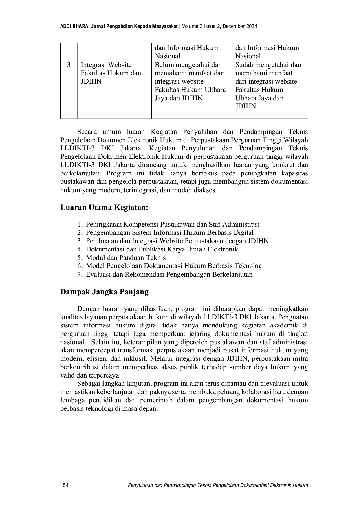 Kegiatan penyuluhan dan pendampingan teknis telah berhasil meningkatkan kapasitas pengelolaan dokumentasi hukum berbasis teknologi di perguruan tinggi wilayah DKI Jakarta.Program ini mampu memperkuat peran perpustakaan hukum sebagai pusat informasi akademik yang modern, efisien, dan mudah diakses.Hasilnya menciptakan fondasi berkelanjutan untuk pengembangan sistem informasi hukum digital di lingkungan akademik melalui integrasi dengan JDIHN.