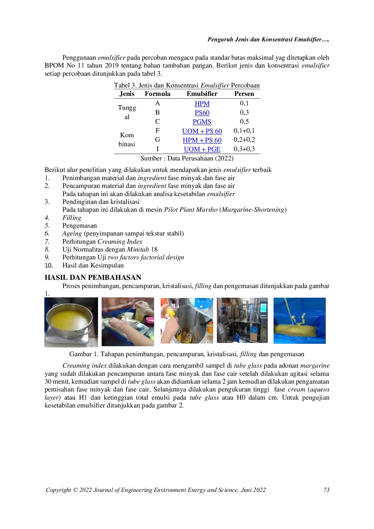 Journal of Engineering Environtmental Energy and ScienceJournal of Engineering Environtmental Energy and ScienceEmulsifier in margarine will help the development of margarine which produces a soft cake and a homogeneous crumb structure. So it is necessary to know the right type and concentration of emulsifier in the process of making margarine. The purpose of this study was to determine the effect of the type and concentration of emulsifier on the creaming index in the margarine experiment with a two factor factorial design. Based on the results of the ANOVA table in both experiments, it can be concluded that in general the type of emulsifier and the concentration of the emulsifier show a significant effect by looking at all the diversity of F Count > F Table at a significance level of 5%. The results of the calculation of the creaming index with several repetitions showed that the optimal result in the single emulsifier experiment was PS-60 0.5% with an average creaming index of 13.98%. While the results of the calculation of the creaming index with several repetitions showed that the optimal results in the double emulsifier experiment were UOM PGE (0.3% each) with an average creaming index of 15.56%.