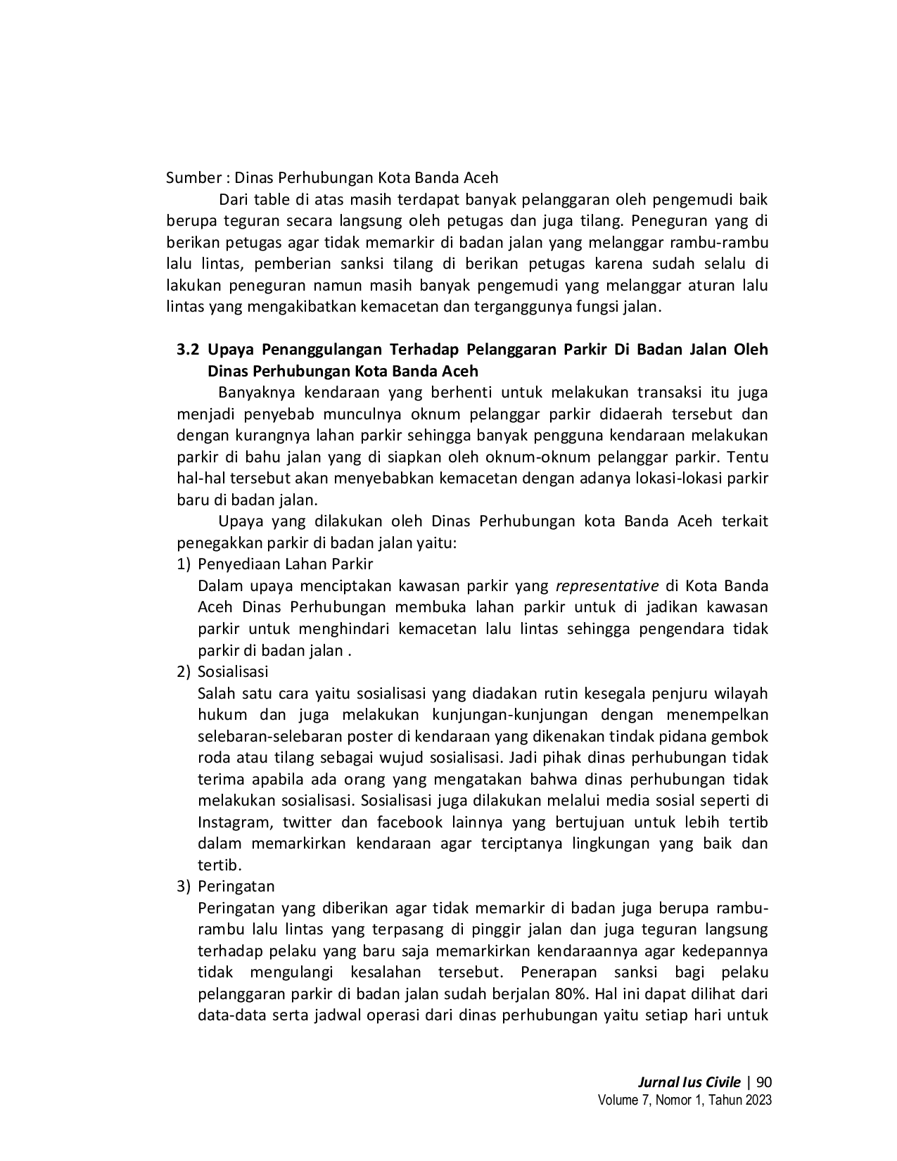 Ius Civile: Refleksi Penegakan Hukum dan KeadilanIus Civile: Refleksi Penegakan Hukum dan KeadilanArticle 106 paragraph (4) letter e of Law Number 22 of 2009 Concerning Road Traffic and Transportation explains that everyone driving a vehicle on a road must comply with the provisions for stopping and parking. Furthermore, Article 287 states that everyone driving a motorized vehicle on a road that violating the rules of order or prohibition stated by traffic signs as referred to in Article 106 paragraph (4) letter b shall be punished by imprisonment for a maximum of 2 (two) months or a fine of a maximum of Rp. 500,000.00 (Five hundred thousand rupiahs). The criminal act was seriously threatened, but in practice the application of the crime has not been carried out, in fact there are still many violations. The purpose of this study is to explain the legal basis for applying criminal sanctions for parking violations on the street, the factors that cause parking violations on the road and explain the efforts made in dealing with parking violations on the road. In writing this thesis the writer uses empirical juridical methods. The empirical juridical method is legal research regarding the enactment or provisions for the implementation of normative law in action on certain legal events that occur in society. Library research was conducted to obtain secondary data, while field research was conducted to obtain primary data through interviews with respondents and informants. The results of the study show that although the rules in the law on traffic and road transportation have been implemented, they are not yet effective, namely because there are still some people who are negligent with traffic signs and the limited availability of parking space in the city of Banda Aceh. Obstacles faced in applying these criminal sanctions are socialization that has not been maximized, the unavailability of sufficient parking lots and the low awareness of violators to comply with the rules. Factors causing parking violations on the road are habitual factors, infrastructure factors, vehicle volume factors, natural conditions factors. Efforts made to deal with violations of parking on the road are the provision of parking lots, outreach, warnings, enforcement, imposition of sanctions. It is suggested to the law enforcement officers of the Banda Aceh City Transportation Service to be able to provide strict sanctions, socialize traffic signs and control overall vehicle drivers, especially four-wheeled vehicles so that these rules are actually realized.