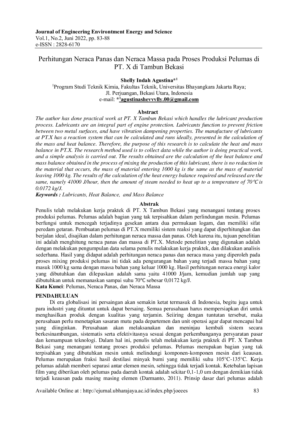 Journal of Engineering Environtmental Energy and ScienceJournal of Engineering Environtmental Energy and SciencePenulis telah melakukan kerja praktek di PT. X Tambun Bekasi yang menangani proses produksi pelumas. Pelumas merupakan bagian yang tak terpisahkan dalam perlindungan mesin, berfungsi mencegah gesekan antara dua permukaan logam, dan memiliki sifat peredam getaran. Pembuatan pelumas di PT.X memiliki sistem reaksi yang dapat diperhitungkan dan berjalan ideal, disajikan dalam perhitungan neraca massa dan panas. Tujuan penelitian ini adalah menghitung neraca panas dan massa di PT.X. Metode penelitian menggunakan pengumpulan data selama kerja praktek dan analisis sederhana. Hasilnya adalah perhitungan neraca panas dan neraca massa pada proses mixing produksi pelumas menunjukkan tidak ada pengurangan bahan, massa bahan masuk 1000 kg sama dengan massa bahan keluar 1000 kg. Hasil perhitungan neraca energi yang dibutuhkan dan dilepaskan adalah sama yaitu 41000 J/jam, dan jumlah uap yang dibutuhkan untuk memanaskan sampai suhu 70℃ sebesar 0,0172 kg/J.