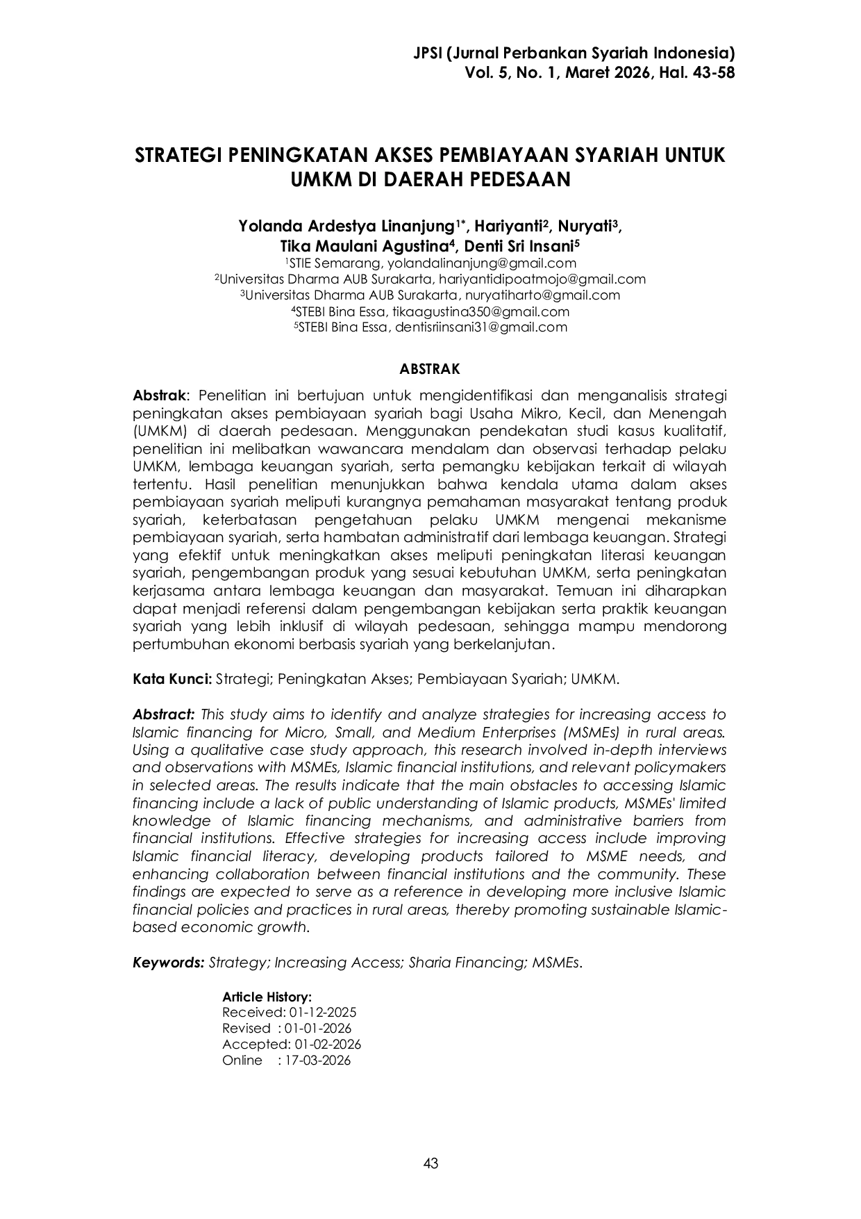 Jurnal Perbankan Syariah Indonesia (JPSI)Jurnal Perbankan Syariah Indonesia (JPSI)Penelitian ini bertujuan untuk mengidentifikasi dan menganalisis strategi peningkatan akses pembiayaan syariah bagi Usaha Mikro, Kecil, dan Menengah (UMKM) di daerah pedesaan. Menggunakan pendekatan studi kasus kualitatif, penelitian ini melibatkan wawancara mendalam dan observasi terhadap pelaku UMKM, lembaga keuangan syariah, serta pemangku kebijakan terkait di wilayah tertentu. Hasil penelitian menunjukkan bahwa kendala utama dalam akses pembiayaan syariah meliputi kurangnya pemahaman masyarakat tentang produk syariah, keterbatasan pengetahuan pelaku UMKM mengenai mekanisme pembiayaan syariah, serta hambatan administratif dari lembaga keuangan. Strategi yang efektif untuk meningkatkan akses meliputi peningkatan literasi keuangan syariah, pengembangan produk yang sesuai kebutuhan UMKM, serta peningkatan kerjasama antara lembaga keuangan dan masyarakat. Temuan ini diharapkan dapat menjadi referensi dalam pengembangan kebijakan serta praktik keuangan syariah yang lebih inklusif di wilayah pedesaan, sehingga mampu mendorong pertumbuhan ekonomi berbasis syariah yang berkelanjutan.