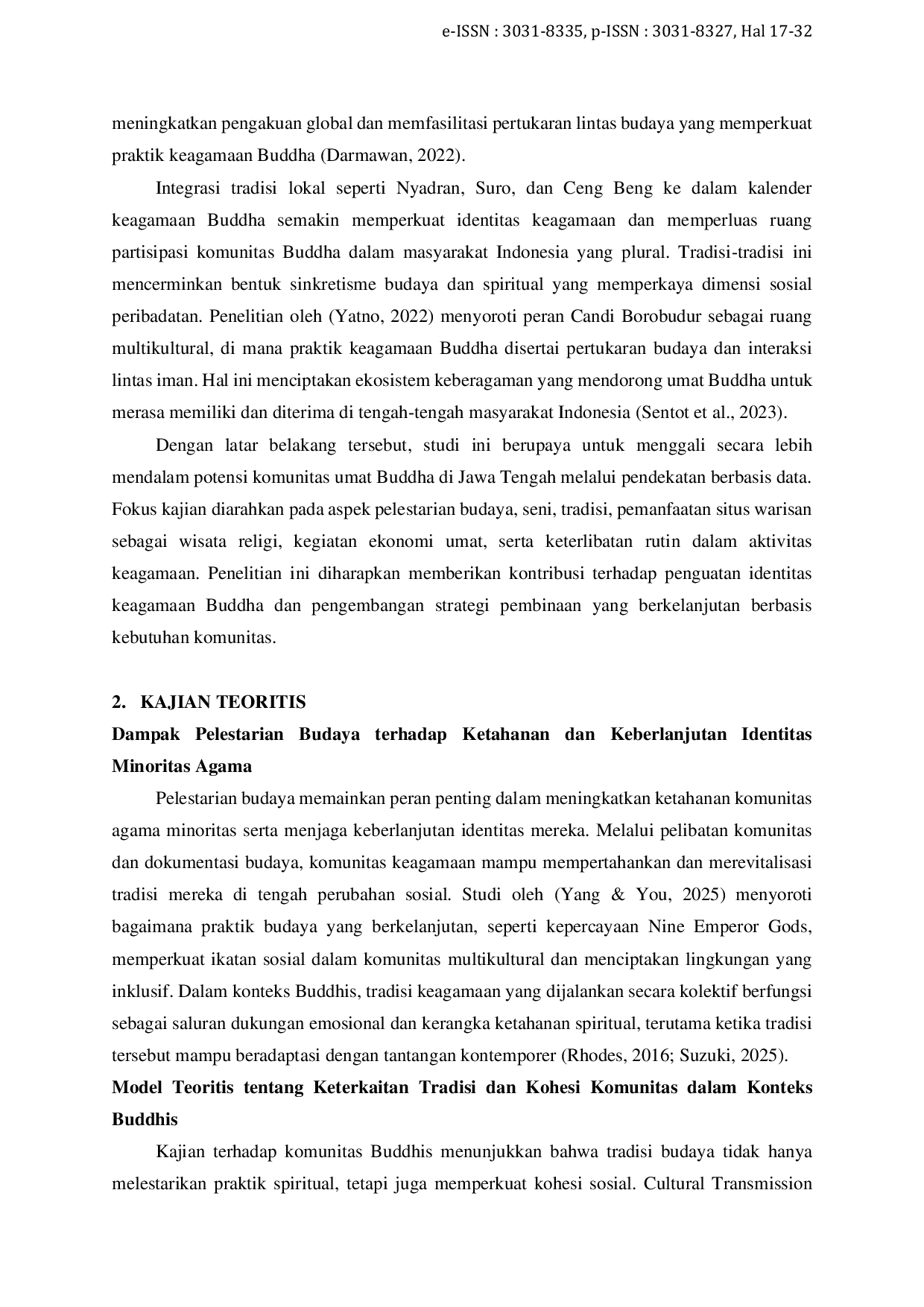Penelitian ini menyimpulkan bahwa pelestarian budaya, kegiatan keagamaan, dan pemanfaatan situs keagamaan seperti Borobudur berperan strategis dalam menjaga kontinuitas spiritual dan memperkuat solidaritas sosial umat Buddha di Jawa Tengah.Keterlibatan aktif dalam ritual dan kegiatan keagamaan meningkatkan kesejahteraan psikologis dan rasa memiliki terhadap tradisi.Selain itu, kegiatan ekonomi berbasis komunitas mendukung kemandirian dan keberlanjutan ekonomi yang berbasis nilai-nilai agama.