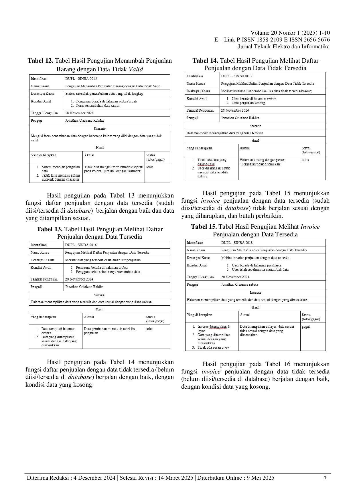 E-Link: Jurnal Teknik Elektro dan InformatikaE-Link: Jurnal Teknik Elektro dan InformatikaPenelitian ini bertujuan untuk menguji fungsionalitas sistem informasi inventori barang di CV Cahaya Baru menggunakan metode black box testing. Tujuan penelitian ini adalah untuk memastikan bahwa sistem dapat memenuhi kebutuhan pengguna dengan baik dan efektif. Tahapan penelitian mencakup pengumpulan data awal, identifikasi dan perencanaan pengujian sistem, serta pelaksanaan pengujian fungsional. Pengujian difokuskan pada fitur-fitur utama, yaitu halaman penjualan dan pembelian, dengan menggunakan teknik equivalence partitioning dalam black box testing untuk mendeteksi kesalahan atau kekurangan dalam logika sistem. Hasil pengujian menunjukkan bahwa dari 19 test case yang diuji, 18 test case berhasil sesuai dengan ekspektasi, sementara 1 test case gagal pada fungsi invoice/detail penjualan dan memerlukan perbaikan lebih lanjut. Penelitian ini diharapkan dapat berkontribusi pada pengembangan sistem informasi inventori yang lebih efisien dan dapat diandalkan.