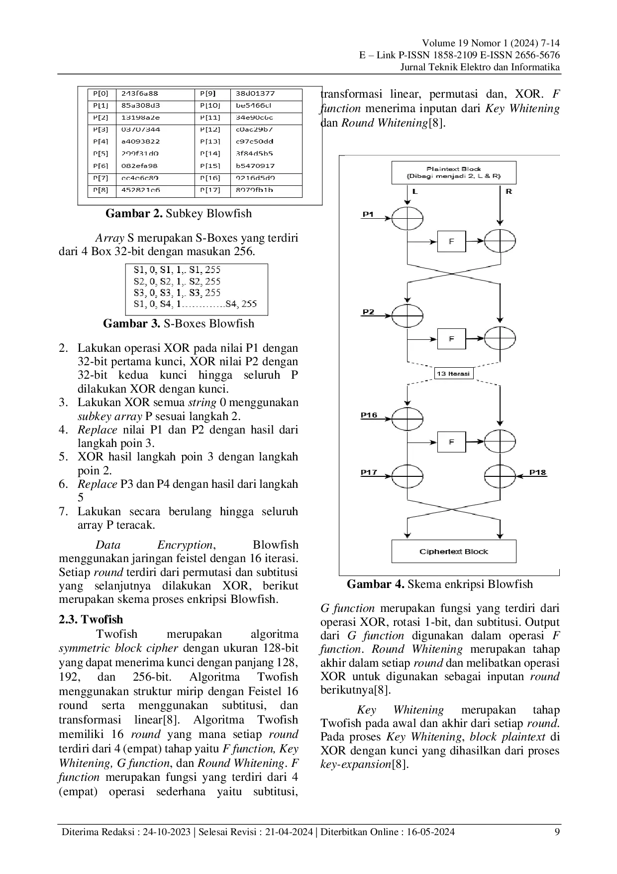 E-Link: Jurnal Teknik Elektro dan InformatikaE-Link: Jurnal Teknik Elektro dan InformatikaPerkembangan teknologi informasi yang pesat beriringan dengan meningkatnya insiden siber kebocoran data. Salah satu metode pengamanan yang dapat diterapkan dalam meningkatkan keamanan data dari kasus kebocoran data yaitu dengan menerapkan kriptografi pada sistem yang mengelola data. Kriptografi berguna untuk melakukan enkripsi plaintext menjadi cipher text sehingga data tidak mudah terbaca. Salah satu algoritma enkripsi yang banyak digunakan dalam pengamanan data yaitu Blowfish dan Twofish. Blowfish dan Twofish merupakan algoritma enkripsi simetris yang menggunakan single key dalam enkripsi dan dekripsi. Pada jurnal ini dilakukan pengujian enkripsi dan dekripsi pada algoritma Blowfish dan Twofish dalam kaitannya dengan kompleksitas ruang dan waktu. Hasil dari pengujian dari 3 data pada 2 perangkat yang berbeda menunjukkan bahwa algoritma Blowfish memiliki kecepatan yang lebih baik daripada Twofish dan Twofish lebih baik daripada Blowfish dalam penggunaan memori serta penggunaan processor mempengaruhi kecepatan proses.