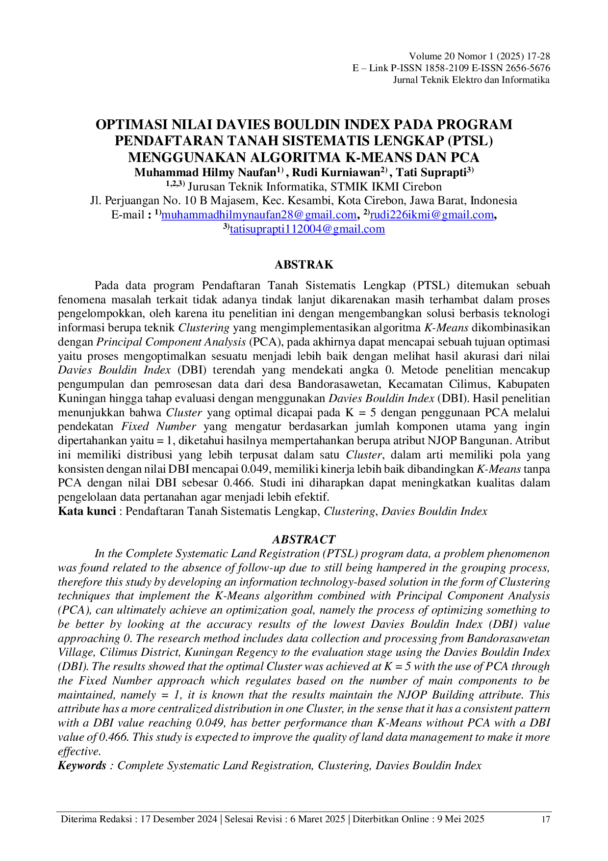 E-Link: Jurnal Teknik Elektro dan InformatikaE-Link: Jurnal Teknik Elektro dan InformatikaPada data program Pendaftaran Tanah Sistematis Lengkap (PTSL) ditemukan sebuah fenomena masalah terkait tidak adanya tindak lanjut dikarenakan masih terhambat dalam proses pengelompokkan, oleh karena itu penelitian ini dengan mengembangkan solusi berbasis teknologi informasi berupa teknik Clustering yang mengimplementasikan algoritma K-Means dikombinasikan dengan Principal Component Analysis (PCA), pada akhirnya dapat mencapai sebuah tujuan optimasi yaitu proses mengoptimalkan sesuatu menjadi lebih baik dengan melihat hasil akurasi dari nilai Davies Bouldin Index (DBI) terendah yang mendekati angka 0. Metode penelitian mencakup pengumpulan dan pemrosesan data dari desa Bandorasawetan, Kecamatan Cilimus, Kabupaten Kuningan hingga tahap evaluasi dengan menggunakan Davies Bouldin Index (DBI). Hasil penelitian menunjukkan bahwa Cluster yang optimal dicapai pada K = 5 dengan penggunaan PCA melalui pendekatan Fixed Number yang mengatur berdasarkan jumlah komponen utama yang ingin dipertahankan yaitu = 1, diketahui hasilnya mempertahankan berupa atribut NJOP Bangunan. Atribut ini memiliki distribusi yang lebih terpusat dalam satu Cluster, dalam arti memiliki pola yang konsisten dengan nilai DBI mencapai 0.049, memiliki kinerja lebih baik dibandingkan K-Means tanpa PCA dengan nilai DBI sebesar 0.466. Studi ini diharapkan dapat meningkatkan kualitas dalam pengelolaan data pertanahan agar menjadi lebih efektif.