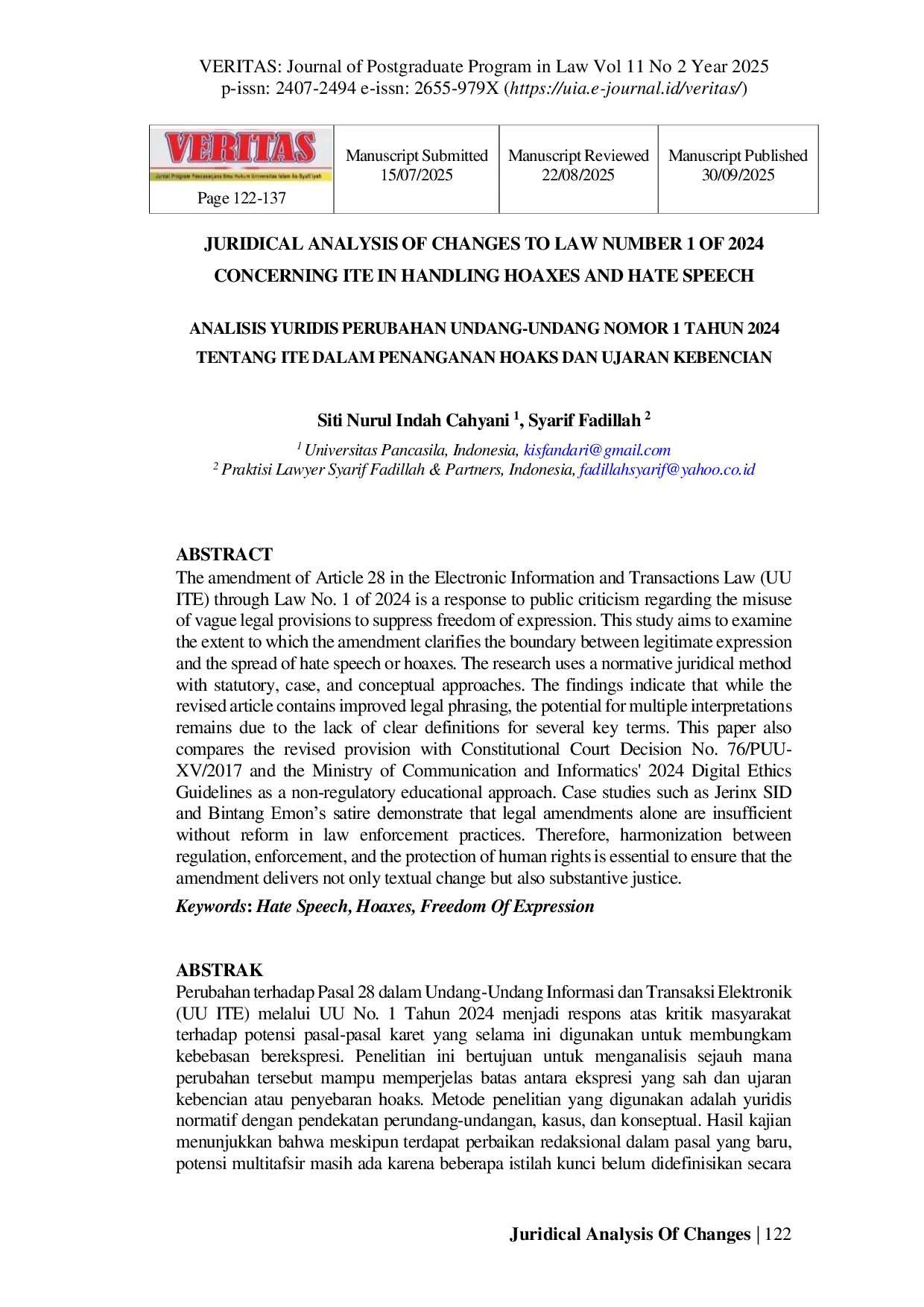VERITASVERITASThe amendment of Article 28 in the Electronic Information and Transactions Law (UU ITE) through Law No. 1 of 2024 is a response to public criticism regarding the misuse of vague legal provisions to suppress freedom of expression. This study aims to examine the extent to which the amendment clarifies the boundary between legitimate expression and the spread of hate speech or hoaxes. The research uses a normative juridical method with statutory, case, and conceptual approaches. The findings indicate that while the revised article contains improved legal phrasing, the potential for multiple interpretations remains due to the lack of clear definitions for several key terms. This paper also compares the revised provision with Constitutional Court Decision No. 76/PUU-XV/2017 and the Ministry of Communication and Informatics 2024 Digital Ethics Guidelines as a non-regulatory educational approach. Case studies such as Jerinx SID and Bintang Emons satire demonstrate that legal amendments alone are insufficient without reform in law enforcement practices. Therefore, harmonization between regulation, enforcement, and the protection of human rights is essential to ensure that the amendment delivers not only textual change but also substantive justice.