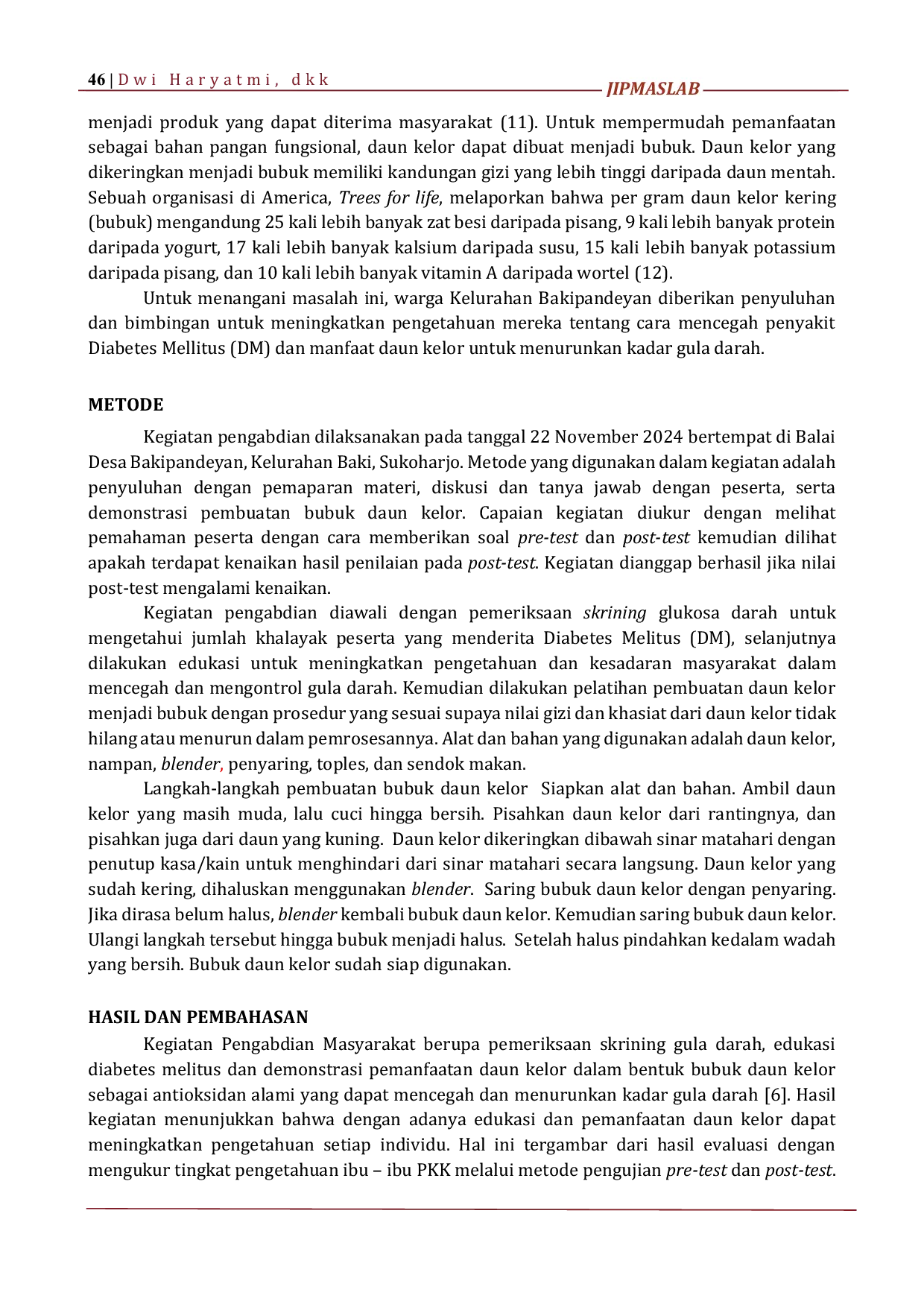 Jurnal Inovasi dan Pemberdayaan Masyarakat Laboratorium Kesehatan (JIPMASLAB)Jurnal Inovasi dan Pemberdayaan Masyarakat Laboratorium Kesehatan (JIPMASLAB)Glukosa darah tinggi merupakan indikasi gangguan metabolisme yang dikenal sebagai Diabetes Mellitus (DM). Berbagai komplikasi kronis dapat timbul akibat kondisi ini. Penderita DM juga rentan terhadap infeksi bakteri, jamur, atau virus. Untuk mencegah penyakit DM, skrining dan edukasi sangat penting. Daun kelor merupakan salah satu tanaman yang membantu mengontrol gula darah. Namun, sebagian masyarakat Indonesia kurang menyadari manfaat daun kelor dan enggan mengonsumsinya karena aromanya yang khas. Kegiatan pengabdian masyarakat ini bertujuan untuk memberikan edukasi kesehatan tentang DM dan pemanfaatan daun kelor sebagai upaya pencegahan diabetes mellitus, menurunkan kadar gula darah, serta mencegah infeksi jamur dan bakteri. Sasaran kegiatan ini adalah ibu-ibu anggota PKK di Desa Bakipandeyan, Baki. Metode pengabdian masyarakat dilakukan melalui skrining DM, edukasi menggunakan media PowerPoint, dan pelatihan pembuatan bubuk daun kelor. Hasil penyuluhan menunjukkan peningkatan pengetahuan peserta, ditandai dengan kenaikan nilai pretest dari 89,63 menjadi 96,06, serta hasil skrining yang menunjukkan 100% anggota yang hadir memiliki kadar gula darah normal. Diharapkan kegiatan ini dapat meningkatkan kesadaran masyarakat terhadap penyakit DM dan pemahaman tentang pencegahannya.