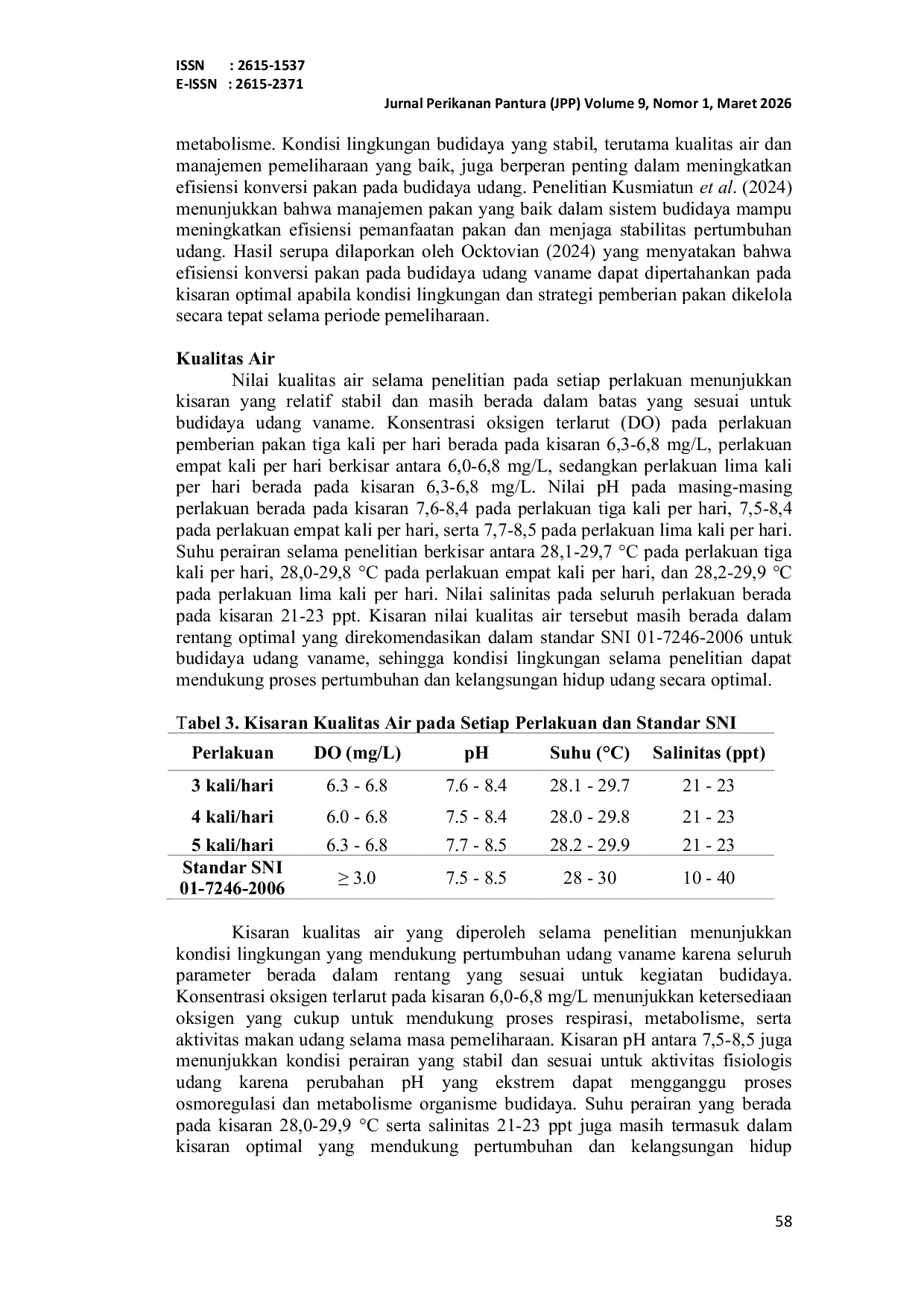 Jurnal Perikanan Pantura (JPP)Jurnal Perikanan Pantura (JPP)Udang vaname (Litopenaeus vannamei) merupakan komoditas penting dalam budidaya perikanan karena memiliki pertumbuhan cepat dan nilai ekonomi tinggi, sehingga pengelolaan pakan menjadi faktor penting dalam meningkatkan efisiensi produksi. Penelitian ini bertujuan untuk mengetahui pengaruh perbedaan frekuensi pemberian pakan terhadap pertumbuhan biomassa dan efisiensi pemanfaatan pakan pada udang vaname fase pemeliharaan DOC 30–60. Penelitian menggunakan metode eksperimen dengan Rancangan Acak Lengkap (RAL) yang terdiri atas tiga perlakuan frekuensi pemberian pakan, yaitu 3 kali/hari, 4 kali/hari, dan 5 kali/hari dengan tiga ulangan. Parameter yang diamati meliputi biomassa udang, nilai konversi pakan (Feed Conversion Ratio / FCR), serta kualitas air yang meliputi suhu, pH, oksigen terlarut (DO), dan salinitas. Data dianalisis menggunakan analisis varians (ANOVA) pada taraf signifikansi 5% dan dilanjutkan dengan uji Beda Nyata Terkecil (BNT). Hasil penelitian menunjukkan bahwa frekuensi pemberian pakan berpengaruh nyata terhadap biomassa udang, dimana perlakuan 3 kali/hari menghasilkan biomassa sebesar 1148,67 ± 13,50 g, perlakuan 4 kali/hari sebesar 1182,33 ± 9,61 g, dan perlakuan 5 kali/hari sebesar 1204,00 ± 6,00 g. Perlakuan pemberian pakan lima kali per hari menghasilkan biomassa tertinggi dibandingkan perlakuan lainnya. Nilai FCR pada setiap perlakuan berada pada kisaran 0,86–0,87 dan tidak menunjukkan perbedaan nyata antar perlakuan. Kisaran kualitas air selama penelitian berada pada kondisi yang sesuai dengan standar SNI 01-7246-2006 sehingga mendukung pertumbuhan udang secara optimal. Hasil penelitian ini menunjukkan bahwa peningkatan frekuensi pemberian pakan dapat meningkatkan biomassa udang vaname, namun tidak memberikan pengaruh nyata terhadap efisiensi pemanfaatan pakan.