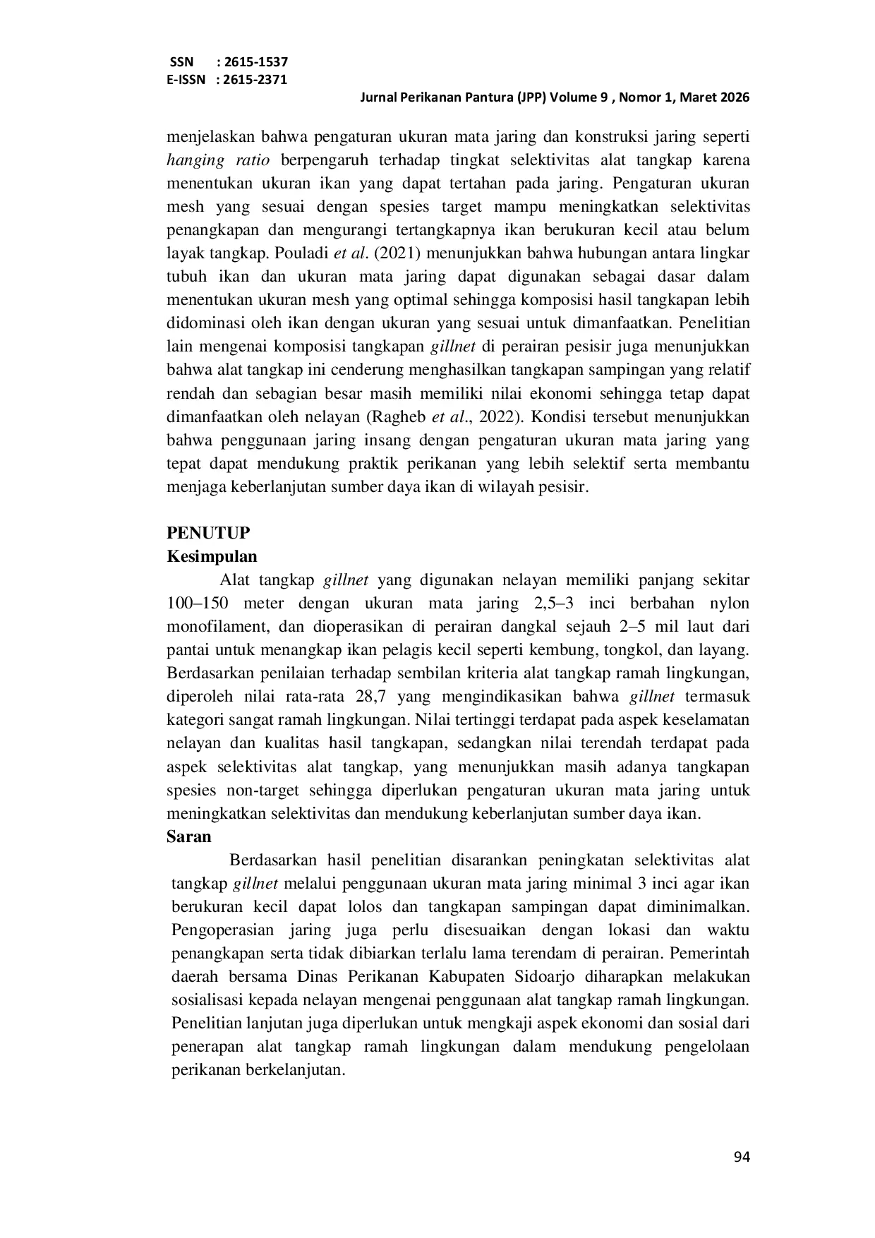 Jurnal Perikanan Pantura (JPP)Jurnal Perikanan Pantura (JPP)Aktivitas perikanan tangkap di Desa Banjarkemuning didominasi oleh nelayan skala kecil yang memanfaatkan alat tangkap pasif berupa jaring insang (gillnet). Karakteristik alat tangkap ini berkaitan dengan tingkat selektivitas tangkapan, dampak terhadap habitat perairan, serta keberlanjutan sumber daya ikan. Penilaian tingkat keramahan lingkungan alat tangkap dilakukan untuk menggambarkan kesesuaian praktik penangkapan dengan prinsip pengelolaan perikanan yang berkelanjutan. Pengumpulan data dilaksanakan pada bulan November hingga Desember 2025 melalui observasi lapangan dan wawancara terstruktur terhadap 30 orang nelayan pengguna jaring insang. Penilaian dilakukan menggunakan metode skoring berdasarkan sembilan kriteria yang mengacu pada pedoman Code of Conduct for Responsible Fisheries dari Food and Agriculture Organization. Hasil penilaian menunjukkan bahwa alat tangkap jaring insang memperoleh nilai total sebesar 28,73 dari rentang skor maksimum 36 sehingga termasuk dalam kategori sangat ramah lingkungan. Komposisi hasil tangkapan terdiri atas delapan jenis ikan yang meliputi enam jenis tangkapan utama dan dua jenis tangkapan sampingan. Operasional jaring insang di wilayah penelitian menunjukkan karakteristik penggunaan yang tidak merusak habitat perairan serta menghasilkan kualitas hasil tangkapan yang baik.
