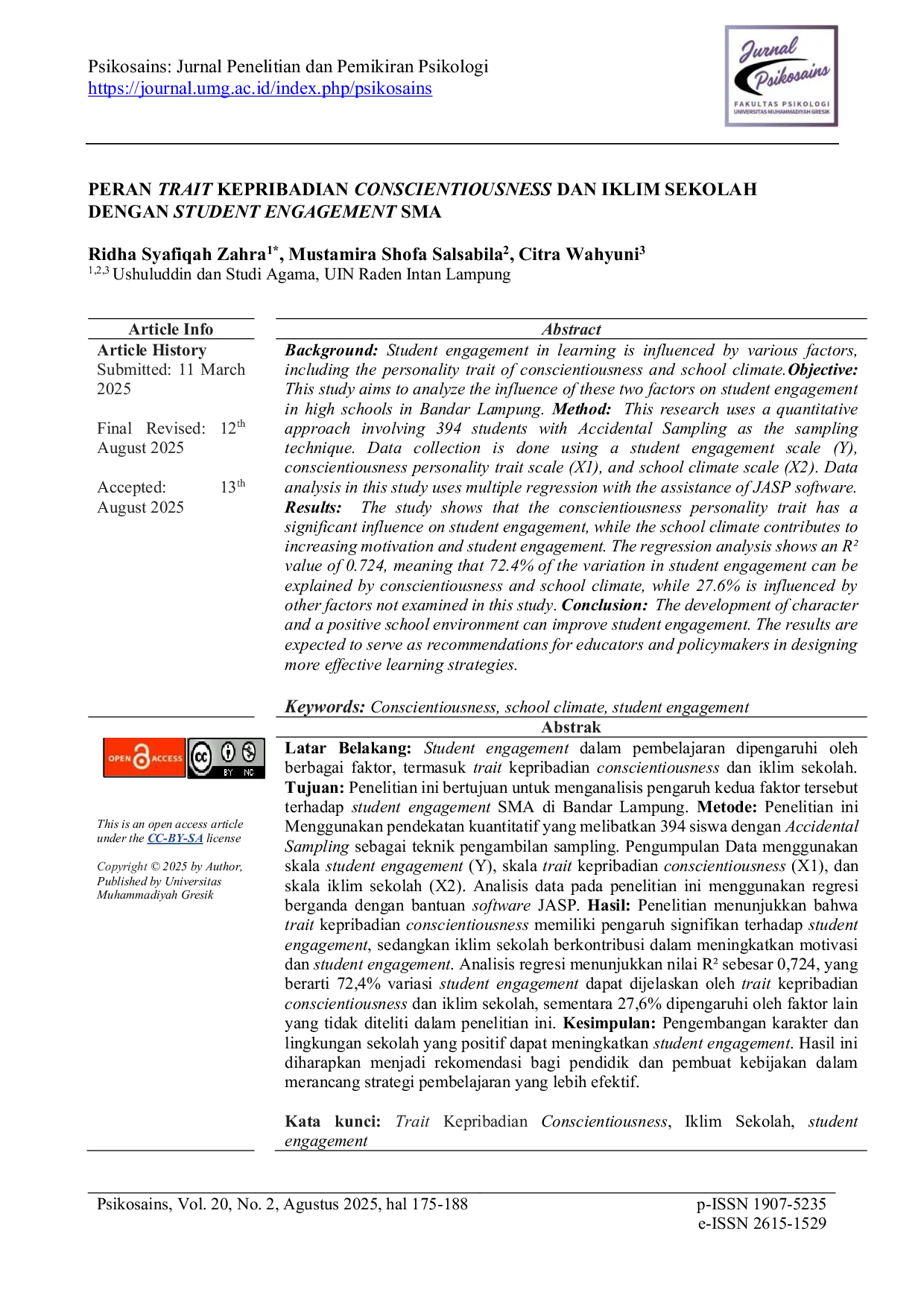 PSIKOSAINS (Jurnal Penelitian dan Pemikiran Psikologi)PSIKOSAINS (Jurnal Penelitian dan Pemikiran Psikologi)Latar Belakang: Student engagement dalam pembelajaran dipengaruhi oleh berbagai faktor, termasuk trait kepribadian conscientiousness dan iklim sekolah. Tujuan: Penelitian ini bertujuan untuk menganalisis pengaruh kedua faktor tersebut terhadap student engagement SMA di Bandar Lampung. Metode: Penelitian ini Menggunakan pendekatan kuantitatif yang melibatkan 394 siswa dengan Accidental Sampling sebagai teknik pengambilan sampling. Pengumpulan Data menggunakan skala student engagement (Y), skala trait kepribadian conscientiousness (X1), dan skala iklim sekolah (X2). Analisis data pada penelitian ini menggunakan regresi berganda dengan bantuan software JASP. Hasil: Penelitian menunjukkan bahwa trait kepribadian conscientiousness memiliki pengaruh signifikan terhadap student engagement, sedangkan iklim sekolah berkontribusi dalam meningkatkan motivasi dan student engagement. Analisis regresi menunjukkan nilai R² sebesar 0,724, yang berarti 72,4% variasi student engagement dapat dijelaskan oleh trait kepribadian conscientiousness dan iklim sekolah, sementara 27,6% dipengaruhi oleh faktor lain yang tidak diteliti dalam penelitian ini. Kesimpulan: Pengembangan karakter dan lingkungan sekolah yang positif dapat meningkatkan student engagement. Hasil ini diharapkan menjadi rekomendasi bagi pendidik dan pembuat kebijakan dalam merancang strategi pembelajaran yang lebih efektif.