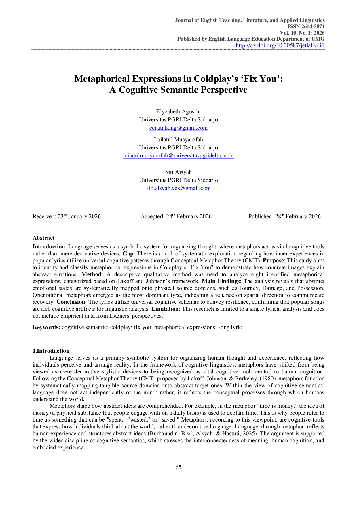 Journal of English Teaching, Literature, and Applied LinguisticsJournal of English Teaching, Literature, and Applied LinguisticsPenelitian ini bertujuan untuk mengidentifikasi dan mengklasifikasikan ungkapan metaforis dalam lagu Coldplay Fix You untuk menunjukkan bagaimana citra konkret menjelaskan emosi abstrak. Metode deskriptif kualitatif digunakan untuk menganalisis delapan ungkapan metaforis yang teridentifikasi, yang dikategorikan berdasarkan kerangka Lakoff dan Johnson. Analisis mengungkapkan bahwa keadaan emosi abstrak secara sistematis dipetakan ke domain sumber fisik, seperti Perjalanan, Kerusakan, dan Kepemilikan. Metafora orientasional muncul sebagai jenis yang paling dominan, yang menunjukkan ketergantungan pada arah spasial untuk mengkomunikasikan pemulihan. Lirik tersebut menggunakan skema kognitif universal untuk menyampaikan ketahanan, menegaskan bahwa lagu populer adalah artefak kognitif yang kaya untuk analisis linguistik. Penelitian ini memiliki keterbatasan karena hanya berfokus pada analisis lirik tunggal dan tidak menyertakan data empiris dari perspektif pendengar.
