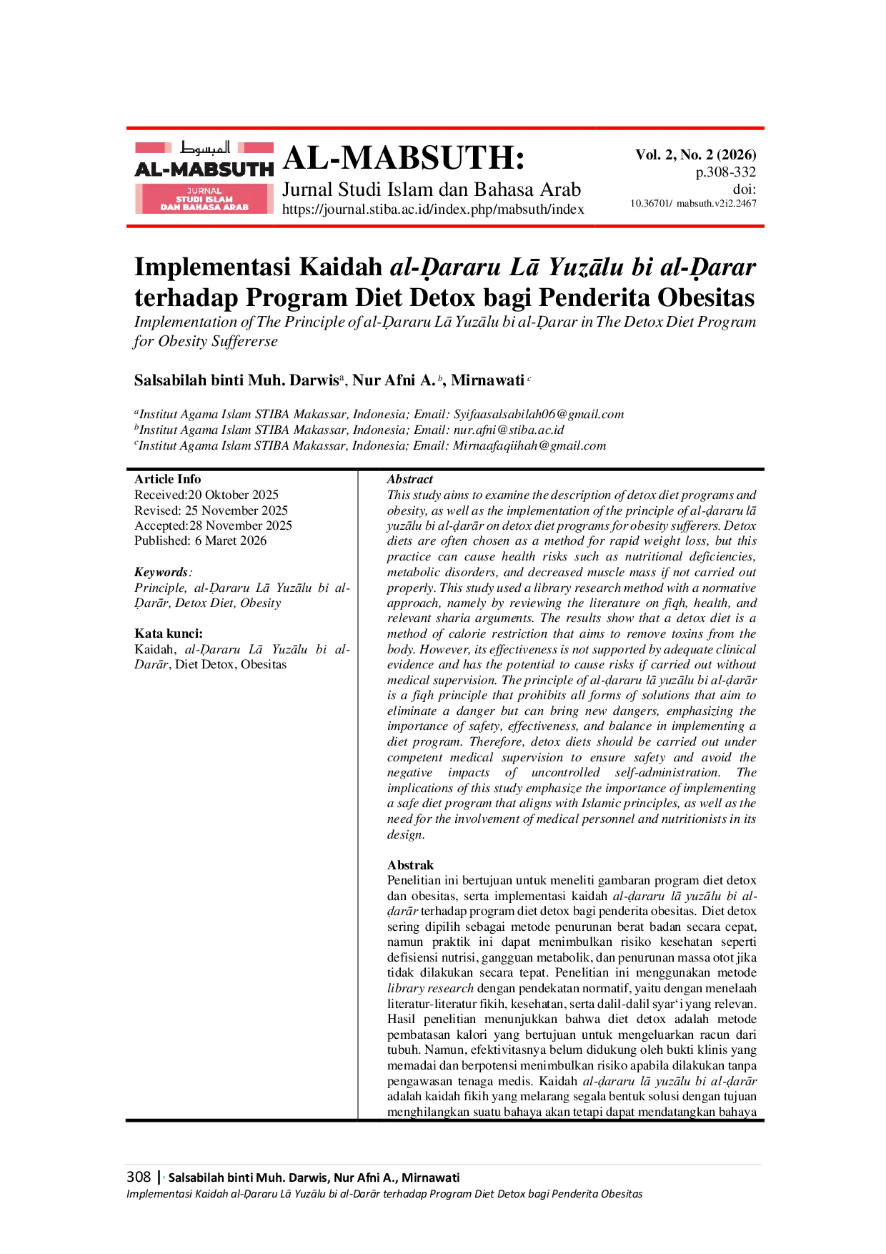 AL-MABSUTH: Jurnal Studi Islam dan Bahasa ArabAL-MABSUTH: Jurnal Studi Islam dan Bahasa ArabPenelitian ini bertujuan untuk meneliti gambaran program diet detox dan obesitas, serta implementasi kaidah al-ḍararu lā yuzālu bi al-ḍarār terhadap program diet detox bagi penderita obesitas. Diet detox sering dipilih sebagai metode penurunan berat badan secara cepat, namun praktik ini dapat menimbulkan risiko kesehatan seperti defisiensi nutrisi, gangguan metabolik, dan penurunan massa otot jika tidak dilakukan secara tepat. Penelitian ini menggunakan metode library research dengan pendekatan normatif, yaitu dengan menelaah literatur-literatur fikih, kesehatan, serta dalil-dalil syari yang relevan. Hasil penelitian menunjukkan bahwa diet detox adalah metode pembatasan kalori yang bertujuan untuk mengeluarkan racun dari tubuh. Namun, efektivitasnya belum didukung oleh bukti klinis yang memadai dan berpotensi menimbulkan risiko apabila dilakukan tanpa pengawasan tenaga medis. Kaidah al-ḍararu lā yuzālu bi al-ḍarār adalah kaidah fikih yang melarang segala bentuk solusi dengan tujuan menghilangkan suatu bahaya akan tetapi dapat mendatangkan bahaya yang baru, kaidah ini menekankan pentingnya aspek keamanan, efektivitas, serta keseimbangan dalam pelaksanaan program diet. Dengan demikian, pelaksanaan diet detox sebaiknya dilakukan di bawah pengawasan medis yang kompeten guna menjamin keselamatan dan menghindari dampak negatif dari praktik mandiri yang tidak terkontrol. Implikasi dari penelitian ini menekankan pentingnya pelaksanaan program diet yang aman dan sesuai dengan prinsip-prinsip Islam, serta perlunya keterlibatan tenaga medis dan ahli gizi dalam perancangannya.
