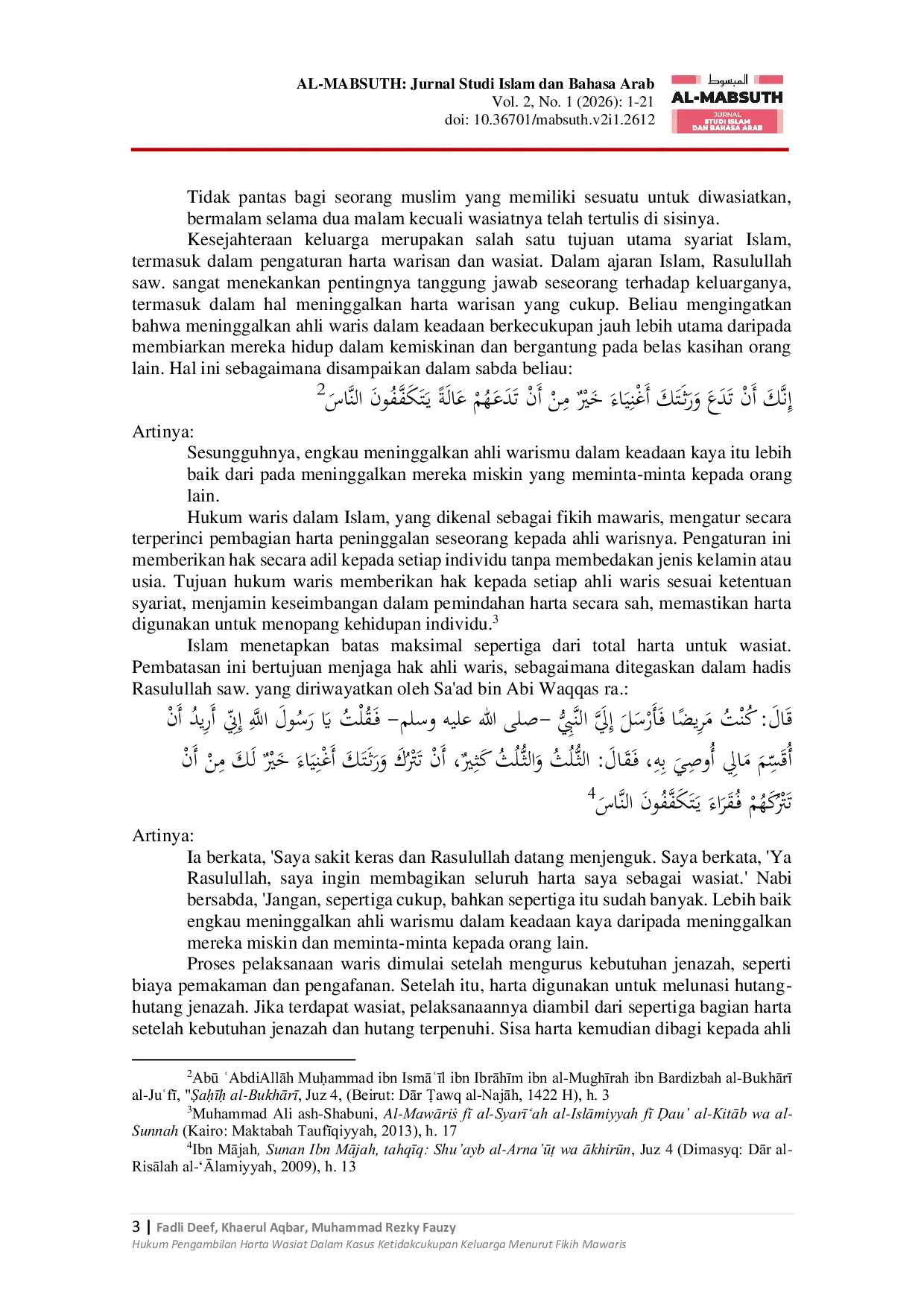 AL-MABSUTH: Jurnal Studi Islam dan Bahasa ArabAL-MABSUTH: Jurnal Studi Islam dan Bahasa ArabPenelitian ini mengkaji hukum terkait pengambilan harta wasiat dalam kondisi ketidakcukupan keluarga melalui metode studi kepustakaan (library research) dengan menggunakan kitab-kitab fikih klasik sebagai sumber primer serta literatur sekunder pendukung. Pendekatan yang digunakan adalah pendekatan normatif dengan analisis isi untuk memahami pandangan para ulama. Hasil penelitian menunjukkan bahwa pengambilan harta wasiat dalam kondisi ketidakcukupan keluarga tidak dibenarkan secara syariat setelah pewaris wafat. Dalam keadaan demikian, pelaksanaan wasiat tetap wajib dilaksanakan secara utuh sesuai ketentuan syariat, selama tidak melebihi sepertiga dari harta peninggalan. Wasiat tidak boleh dibatalkan atau dikurangi setelah pewaris wafat hanya karena alasan kemiskinan ahli waris. Perlindungan terhadap ahli waris yang lemah menjadi tanggung jawab pewaris semasa hidup sebelum memutuskan wasiat. Penelitian ini diharapkan dapat memperkaya khazanah keilmuan dalam bidang fikih mawaris, khususnya terkait pelaksanaan wasiat, serta menjadi referensi akademik dalam kajian hukum Islam, waris, dan wasiat. Secara praktis, penelitian ini dapat memberikan pedoman bagi para praktisi hukum, hakim syariah, dan masyarakat umum dalam mengatasi konflik pembagian warisan dan wasiat, khususnya ketika ahli waris mengalami kesulitan ekonomi.