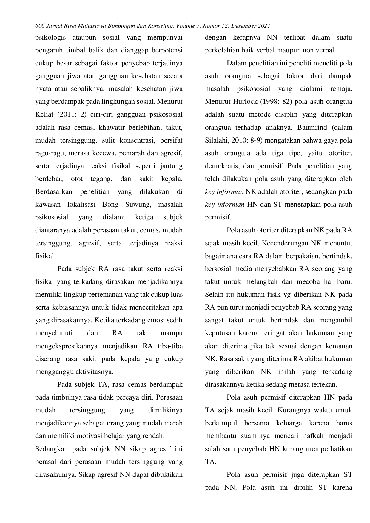 Jurnal Riset Mahasiswa Bimbingan Dan KonselingJurnal Riset Mahasiswa Bimbingan Dan KonselingKeberadaan area prostitusi memiliki dampak negatif pada perkembangan anak, namun sejauh ini belum diperoleh secara detail dampak psikososial jika ditinjau dari pola asuh. Penelitian ini bertujuan mengeksplorasi masalah psikososial remaja di “Bong Suwung Yogyakarta. Penelitian ini merupakan penelitian studi kasus dengan lokasi penelitian di “Bong Suwung Yogyakarta dan subjek penelitian berjumlah tiga orang dengan informan kunci berjumlah 3 orang. Instrumen yang digunakan untuk mengumpulkan data adalah pedoman wawancara dan pedoman observasi. Uji keabsahan data menggunakan trianggulasi. Teknik analisis dengan cara mereduksi data kemudian data yang telah direduksi disusun dalam penyajian data. Hasil penelitian ini menunjukkan bahwa pola asuh yang diterapkan oleh orangtua dan wali subjek adalah otoriter dan permisif karena lingkungan tempat tinggal yang cenderung menerapkan hal serupa. Dampak masalah psikososial yang dialami subjek adalah merasa tidak percaya diri, tertutup, menarik diri dari lingkungan, rendahnya motivasi diri, mudah tersinggung, pemarah, terindikasi bersikap antisosial bahkan agresif.