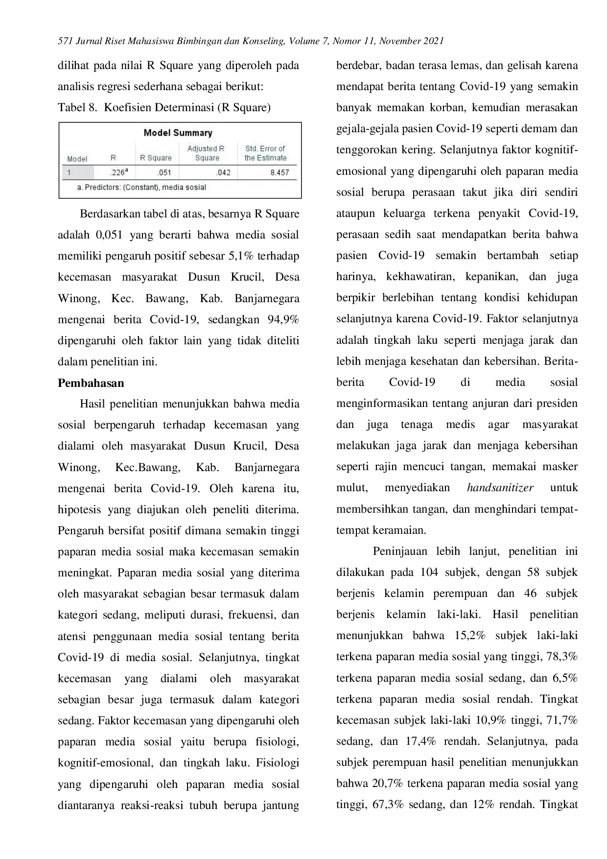Berdasarkan hasil penelitian, media sosial berpengaruh positif dan signifikan terhadap kecemasan mengenai berita Covid-19.Pengaruh yang diberikan bersifat positif, yang berarti semakin tinggi paparan media sosial, maka kecemasan semakin meningkat.Media sosial memberikan pengaruh sebesar 5,1% terhadap kecemasan masyarakat, sementara 94,9% dipengaruhi oleh faktor lain.