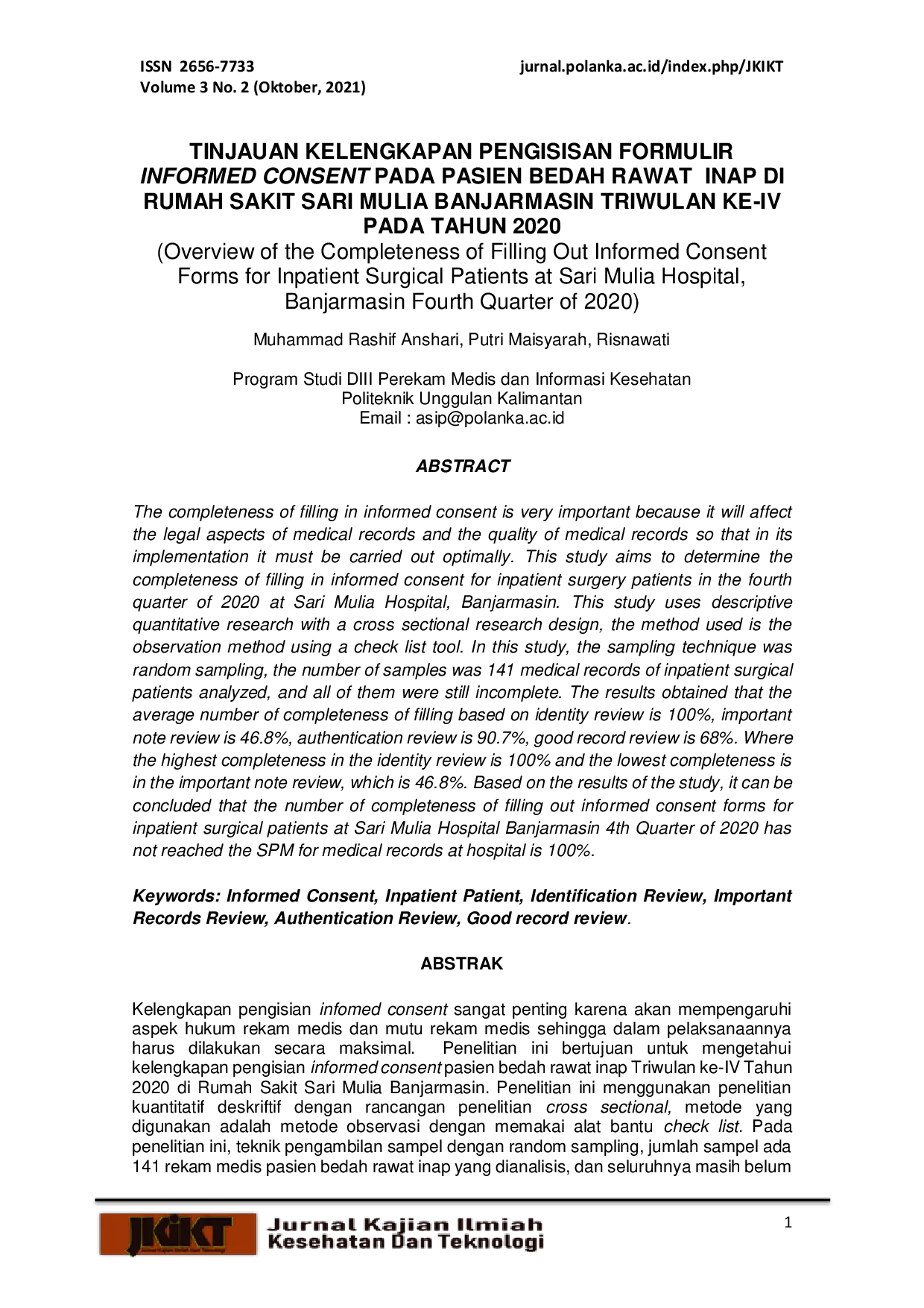 Jurnal Kajian Ilmiah Kesehatan dan TeknologiJurnal Kajian Ilmiah Kesehatan dan TeknologiKelengkapan pengisian infomed consent sangat penting karena akan mempengaruhi aspek hukum rekam medis dan mutu rekam medis sehingga dalam pelaksanaannya harus dilakukan secara maksimal. Penelitian ini bertujuan untuk mengetahui kelengkapan pengisian informed consent pasien bedah rawat inap Triwulan ke-IV Tahun 2020 di Rumah Sakit Sari Mulia Banjarmasin. Penelitian ini menggunakan penelitian kuantitatif deskriftif dengan rancangan penelitian cross sectional, metode yang digunakan adalah metode observasi dengan memakai alat bantu check list. Pada penelitian ini, teknik pengambilan sampel dengan random sampling, jumlah sampel ada 141 rekam medis pasien bedah rawat inap yang dianalisis, dan seluruhnya masih belum lengkap. Hasil penelitian diperoleh rata-rata angka kelengkapan pengisian berdasarkan review identitas 100%, review catatan yang penting 46,8%, review autentifikasi 90,7%, review catatan yang baik 68%. Dimana Kelengkapan tertinggi pada review identitas yaitu 100% dan kelengkapan terendah ada pada review catatan yang penting yaitu 46,8%. Berdasarkan hasil penelitian dapat disimpulkan bahwa angka kelengkapan pengisian lembar informed consent pasien bedah rawat inap di Rumah Sakit Sari Mulia Banjarmasin Triwulan ke-IV Tahun 2020 belum mencapai SPM rekam medis di rumah sakit yaitu 100%.