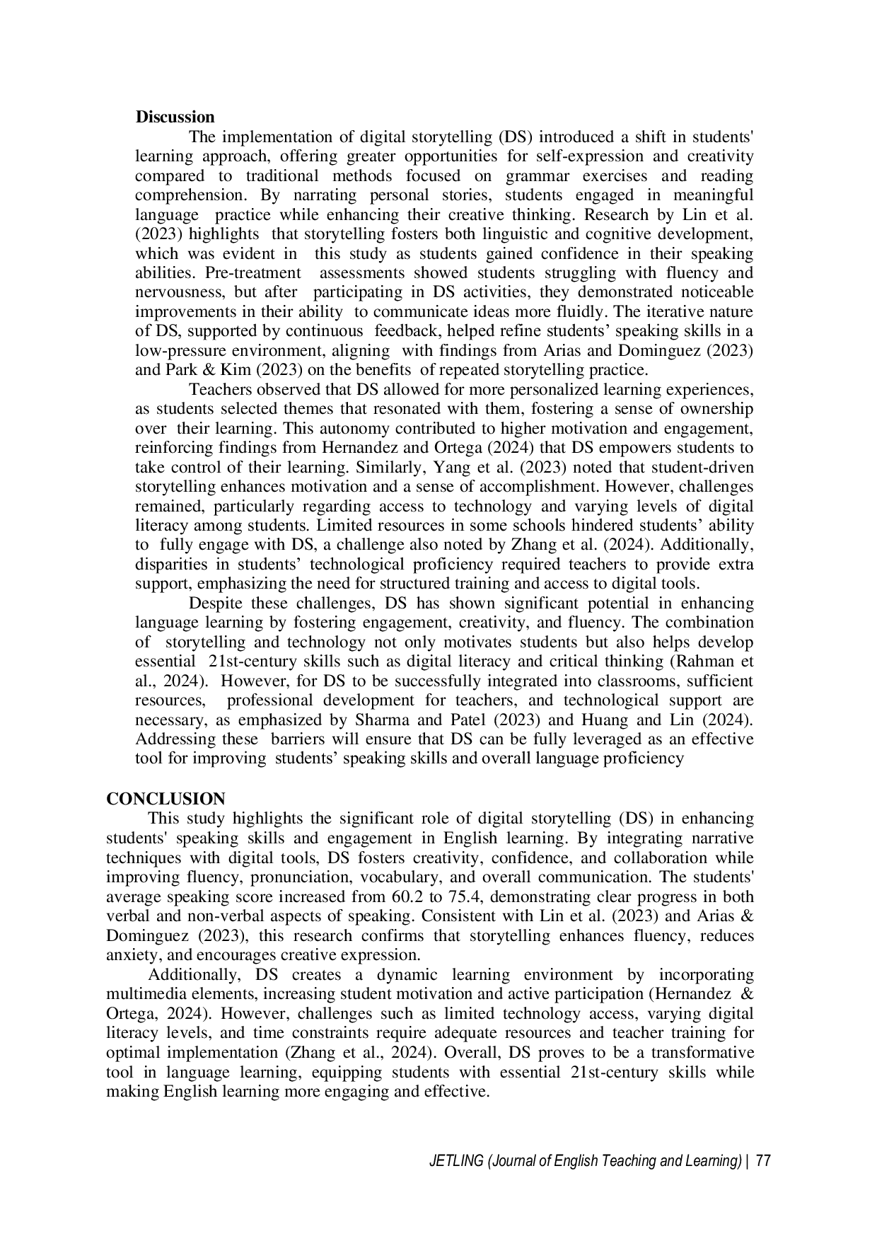 This study demonstrates the significant role of digital storytelling in enhancing students speaking skills and engagement in English learning.By integrating narrative techniques with digital tools, digital storytelling fosters creativity, confidence, and collaboration while improving fluency, pronunciation, vocabulary, and overall communication.Despite challenges such as limited technology access and varying digital literacy levels, digital storytelling proves to be a transformative tool in language learning, equipping students with essential 21st-century skills and making English learning more effective.