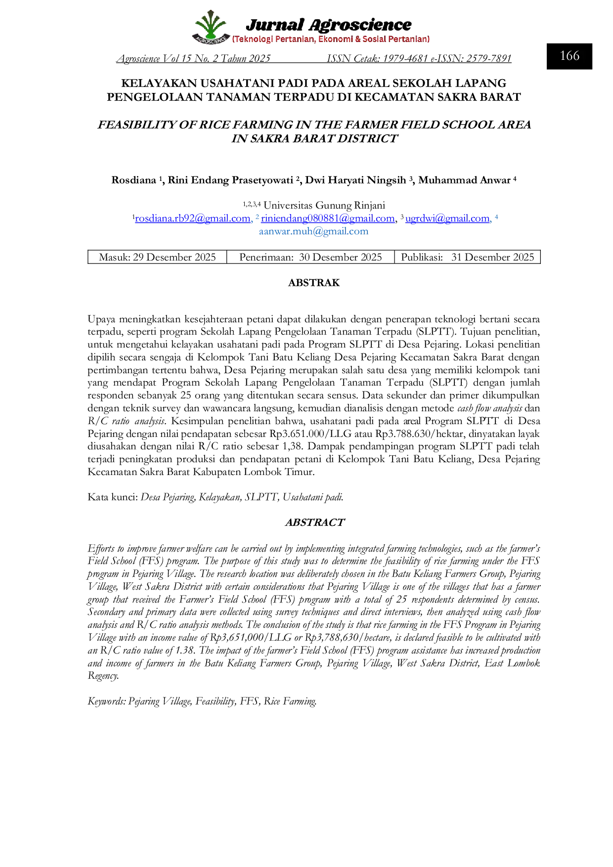 AGROSCIENCEAGROSCIENCEUpaya meningkatkan kesejahteraan petani dapat dilakukan dengan penerapan teknologi bertani secara terpadu, seperti program Sekolah Lapang Pengelolaan Tanaman Terpadu (SLPTT). Tujuan penelitian ini adalah untuk mengetahui kelayakan usahatani padi pada Program SLPTT di Desa Pejaring. Lokasi penelitian dipilih secara sengaja di Kelompok Tani Batu Keliang Desa Pejaring Kecamatan Sakra Barat dengan pertimbangan bahwa Desa Pejaring merupakan salah satu desa yang memiliki kelompok tani yang mendapat Program SLPTT dengan jumlah responden sebanyak 25 orang yang ditentukan secara sensus. Data sekunder dan primer dikumpulkan dengan teknik survey dan wawancara langsung, kemudian dianalisis dengan metode cash flow analysis dan R/C ratio analysis. Kesimpulan penelitian menunjukkan bahwa usahatani padi pada areal Program SLPTT di Desa Pejaring dengan nilai pendapatan sebesar Rp3.651.000/LLG atau Rp3.788.630/hektar, dinyatakan layak diusahakan dengan nilai R/C ratio sebesar 1,38. Dampak pendampingan program SLPTT padi telah terjadi peningkatan produksi dan pendapatan petani di Kelompok Tani Batu Keliang, Desa Pejaring Kecamatan Sakra Barat Kabupaten Lombok Timur.