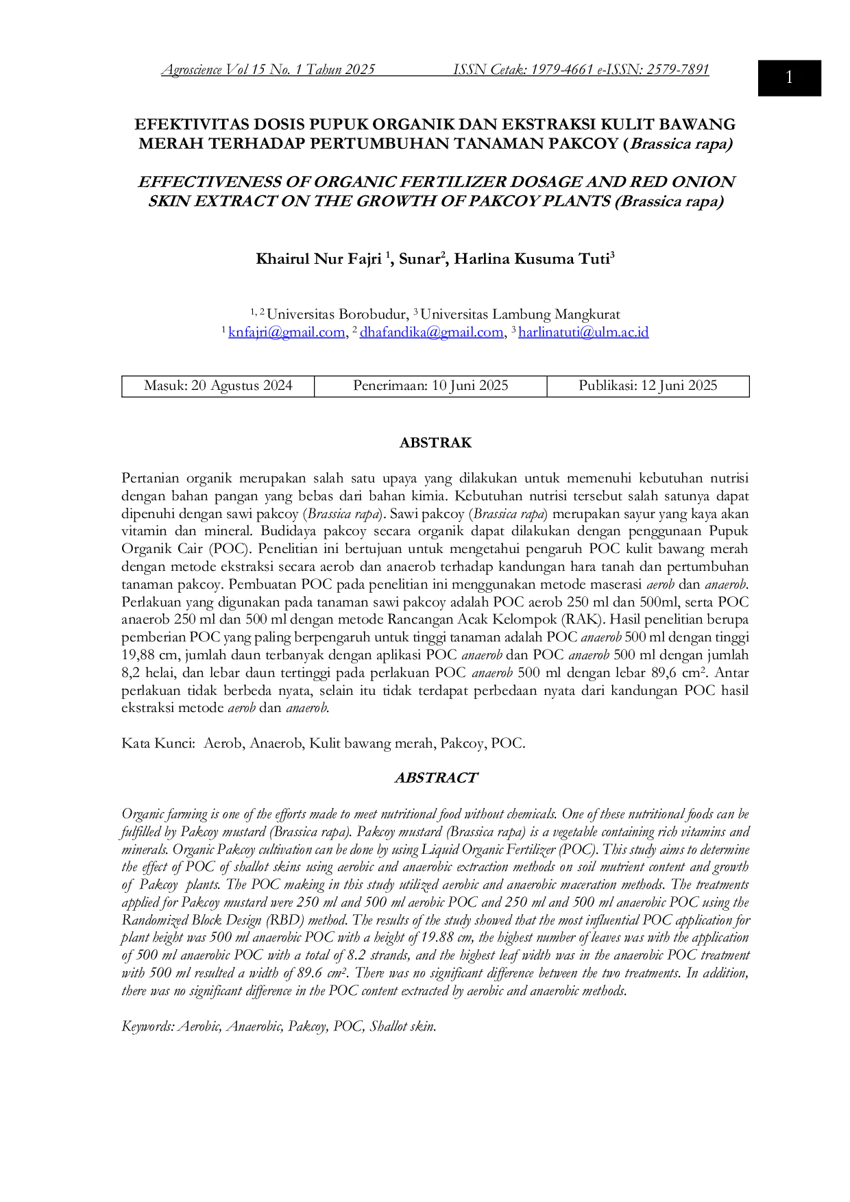 AGROSCIENCEAGROSCIENCEPertanian organik merupakan salah satu upaya untuk memenuhi kebutuhan nutrisi dengan bahan pangan bebas bahan kimia. Sawi pakcoy (Brassica rapa) kaya akan vitamin dan mineral, dan budidayanya secara organik dapat dilakukan dengan Pupuk Organik Cair (POC). Penelitian ini bertujuan untuk mengetahui pengaruh POC kulit bawang merah dengan metode ekstraksi aerob dan anaerob terhadap kandungan hara tanah dan pertumbuhan tanaman pakcoy. POC dibuat dengan metode maserasi aerob dan anaerob. Perlakuan pada tanaman pakcoy adalah POC aerob 250 ml dan 500ml, serta POC anaerob 250 ml dan 500 ml dengan Rancangan Acak Kelompok (RAK). Hasil penelitian menunjukkan bahwa pemberian POC anaerob 500 ml paling berpengaruh untuk tinggi tanaman (19,88 cm), jumlah daun terbanyak (8,2 helai), dan lebar daun tertinggi (89,6 cm2). Tidak terdapat perbedaan nyata antar perlakuan, dan juga tidak terdapat perbedaan nyata kandungan POC hasil ekstraksi metode aerob dan anaerob.