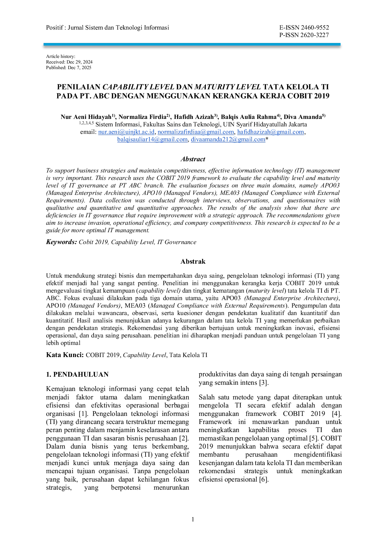 POSITIF : Jurnal Sistem dan Teknologi InformasiPOSITIF : Jurnal Sistem dan Teknologi InformasiUntuk mendukung strategi bisnis dan mempertahankan daya saing, pengelolaan teknologi informasi (TI) yang efektif menjadi hal yang sangat penting. Penelitian ini menggunakan kerangka kerja COBIT 2019 untuk mengevaluasi tingkat kemampuan (capability level) dan tingkat kematangan (maturity level) tata kelola TI di PT. ABC. Fokus evaluasi dilakukan pada tiga domain utama, yaitu APO03 (Managed Enterprise Architecture), APO10 (Managed Vendors), dan MEA03 (Managed Compliance with External Requirements). Pengumpulan data dilakukan melalui wawancara, observasi, serta kuesioner dengan pendekatan kualitatif dan kuantitatif. Hasil analisis menunjukkan adanya kekurangan dalam tata kelola TI yang memerlukan perbaikan dengan pendekatan strategis. Rekomendasi yang diberikan bertujuan untuk meningkatkan inovasi, efisiensi operasional, dan daya saing perusahaan. Penelitian ini diharapkan menjadi panduan untuk pengelolaan TI yang lebih optimal.