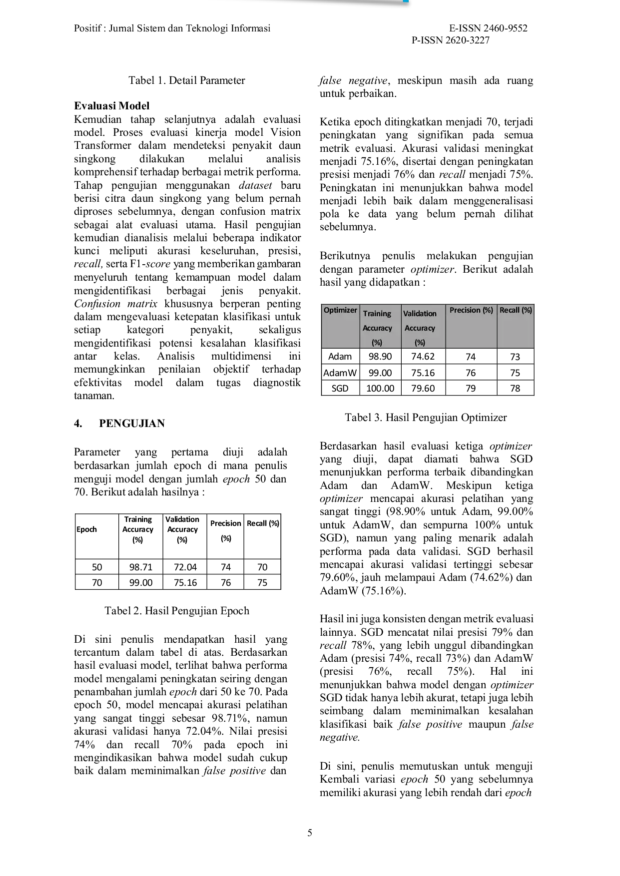 Model klasifikasi penyakit daun singkong berbasis Vision Transformer dengan parameter optimizer SGD, 50 epoch, dan batch size 32 menghasilkan akurasi validasi tertinggi (83,16 %) dibandingkan konfigurasi lain, meskipun masih terjadi overfitting dengan akurasi pelatihan 100 %.Peningkatan jumlah epoch dari 50 ke 70 tidak meningkatkan kinerja model.sebaliknya, penggunaan SGD pada 50 epoch meningkatkan akurasi validasi hampir 4 %.Optimizer SGD secara konsisten mengungguli Adam dan AdamW dalam akurasi, presisi, dan recall, menunjukkan kemampuannya dalam generalisasi.Dengan demikian, rekomendasi baseline untuk pengembangan model selanjutnya adalah menggunakan Vision Transformer dengan SGD, 50 epoch, dan batch size 32.