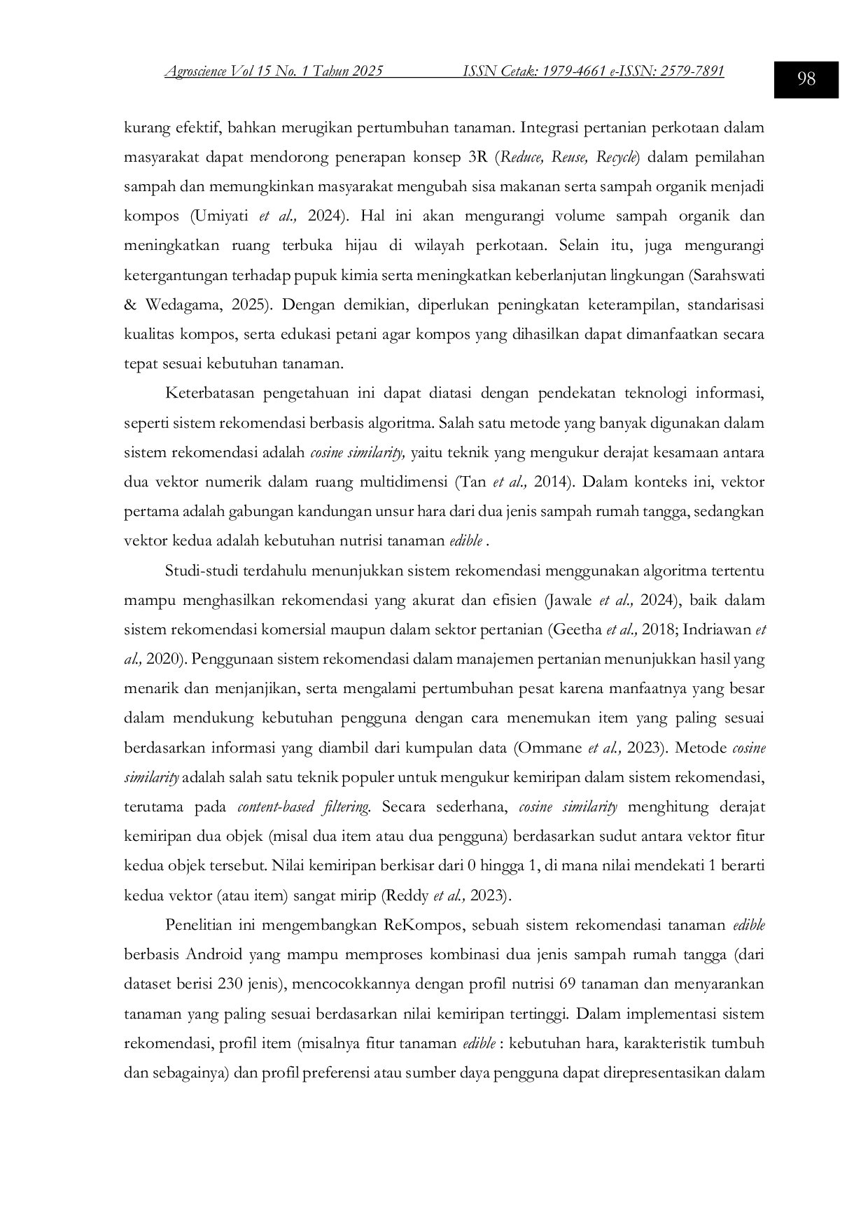 AGROSCIENCEAGROSCIENCEKemandirian pangan rumah tangga merupakan elemen penting dalam mewujudkan ketahanan pangan nasional yang berkelanjutan. Di sisi lain, sebagian besar rumah tangga di Indonesia menghasilkan sampah organik setiap hari namun belum dikelola secara optimal. Penelitian ini bertujuan mengembangkan ReKompos, sebuah sistem rekomendasi tanaman edible berbasis Android yang memanfaatkan kandungan unsur hara dari dua jenis sampah organik untuk merekomendasikan tanaman paling sesuai berdasarkan metode cosine similarity. Dataset terdiri dari 230 jenis sampah organik dengan atribut Nitrogen (N), Fosfor (P), Kalium (K), dan Kalsium (Ca), serta 69 tanaman edible dengan profil kebutuhan nutrisi masing-masing. Sistem menggabungkan dua vektor nutrisi sampah, kemudian menghitung tingkat kesamaan terhadap vektor kebutuhan tanaman untuk menentukan rekomendasi. Hasil pengujian menunjukkan bahwa sistem mampu memberikan rekomendasi tanaman secara proporsional dan sesuai secara agronomis, dengan nilai similarity tertinggi mencapai 0.96 (misalnya pada kombinasi Kulit Pisang dan Ampas Kopi terhadap tanaman Mentimun dan Terong). Implementasi sistem berjalan efisien di platform Android dan dapat digunakan secara offline. ReKompos berpotensi menjadi solusi berbasis teknologi yang mendukung pengelolaan sampah rumah tangga, pertanian pekarangan dan konsumsi berkelanjutan.