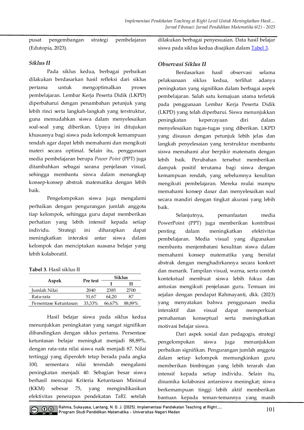 Jurnal Fibonaci: Jurnal Pendidikan MatematikaJurnal Fibonaci: Jurnal Pendidikan MatematikaPenelitian ini dilatarbelakangi oleh rendahnya hasil belajar matematika siswa kelas VIII E SMP Negeri 15 Palu, di mana hanya 33,33% siswa yang mencapai Kriteria Ketuntasan Minimal (KKM) 75 dengan rata-rata nilai 53. Kondisi ini disebabkan oleh pembelajaran konvensional yang belum memperhatikan perbedaan kemampuan siswa, sehingga siswa berkemampuan rendah tertinggal dan yang berkemampuan tinggi kehilangan tantangan belajar. Penelitian ini bertujuan untuk meningkatkan hasil belajar matematika melalui penerapan pendekatan Teaching at the Right Level (TaRL), yang menyesuaikan pembelajaran berdasarkan tingkat kemampuan siswa. Metode yang digunakan adalah Penelitian Tindakan Kelas (PTK) model Kurt Lewin yang meliputi empat tahap: perencanaan, pelaksanaan, observasi, dan refleksi. Subjek penelitian adalah 30 siswa kelas VIII E. Data dikumpulkan melalui tes hasil belajar, observasi, dan dokumentasi, dengan instrumen yang telah divalidasi oleh ahli. Hasil penelitian menunjukkan peningkatan signifikan pada setiap siklus: persentase ketuntasan belajar meningkat dari 33,33% (pre-test) menjadi 66,67% pada siklus I, dan mencapai 88,89% pada siklus II, dengan rata-rata nilai akhir 87. Hasil ini menunjukkan bahwa pendekatan TaRL efektif dalam mengatasi perbedaan tingkat pemahaman siswa, meningkatkan keaktifan, kepercayaan diri, serta hasil belajar matematika secara keseluruhan. Dengan demikian, penerapan pendekatan TaRL dapat dijadikan alternatif strategi pembelajaran adaptif yang mendukung prinsip Kurikulum Merdeka.