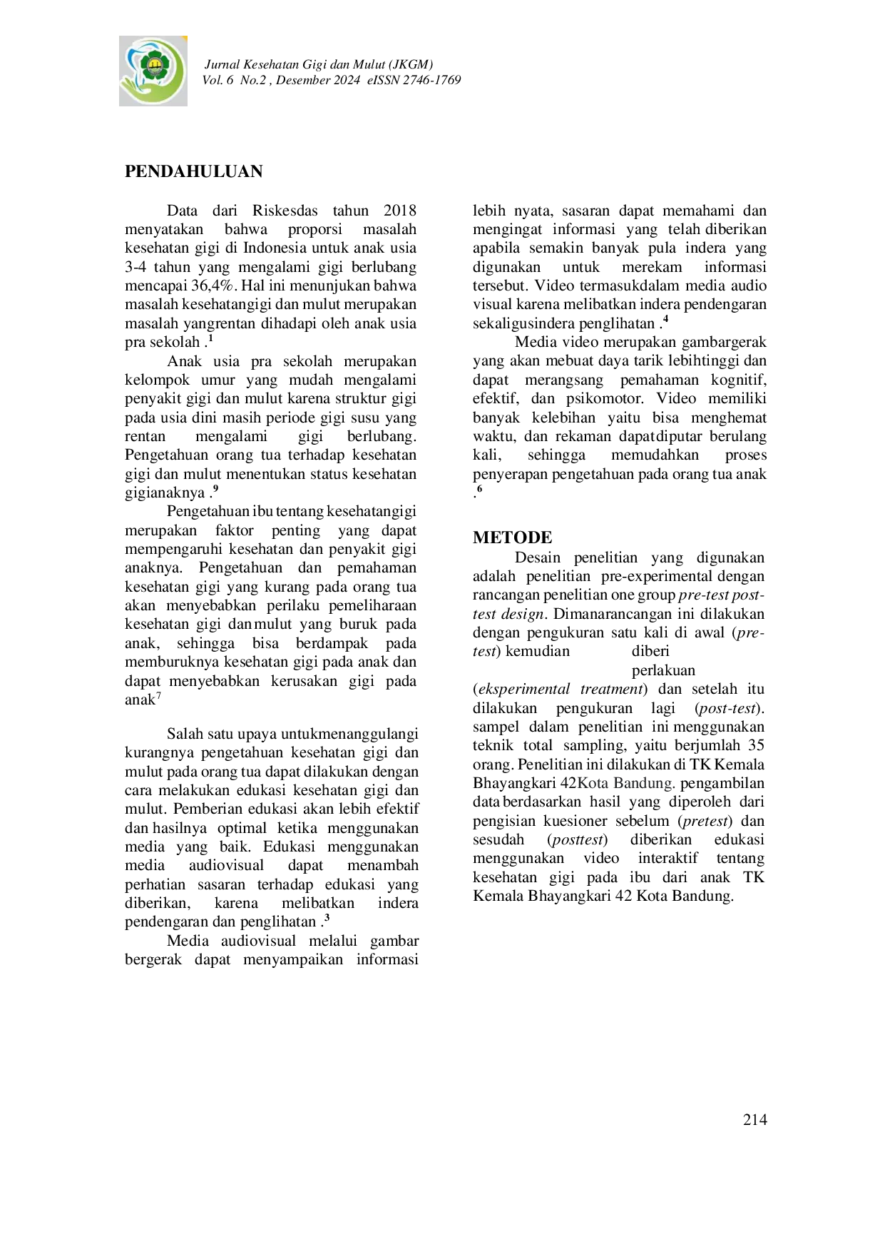 Jurnal Kesehatan Gigi dan Mulut (JKGM)Jurnal Kesehatan Gigi dan Mulut (JKGM)Latar belakang: Anak usia pra sekolah merupakan kelompok umur yang mudah mengalami penyakit gigi dan mulut. Pengetahuan ibu tentang kesehatan gigi merupakan faktor penting yang dapat mempengaruhi kesehatan gigi anaknya. Edukasi menggunakan video dapat memudahkan proses penyerapan pengetahuan ibu tentang kesehatan gigi. Penelitian ini bertujuan untuk mengetahui di TK Kemala Bhayangkari 42 Kota Bandung.