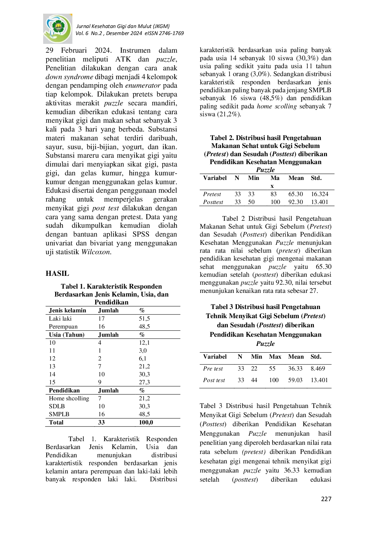 Jurnal Kesehatan Gigi dan Mulut (JKGM)Jurnal Kesehatan Gigi dan Mulut (JKGM)Anak dengan Down syndrome memiliki tingkat IQ di bawah normal, sehingga sulit memahami materi dengan metode standar, namun penggunaan media seperti puzzle dapat membantu penyampaian informasi secara lebih efektif. Tujuan penelitian ini untuk mengetahui pengaruh media puzzle pada pengetahuan kesehatan gigi dan mulut anak down syndrome di PIK POTADS Bandung. Metode penelitian ini menggunakan pre eksperimen dengan desain One Group Pretest Posttest. Subjek 33 anak down syndrome dengan rentang usia 9-15 tahun yang dibagi menjadi 4 kelompok dengan pendamping oleh enumerator pada tiap kelompok. Dilakukan pretes berupa aktivitas merakit puzzle secara mandiri, kemudian diberikan edukasi tentang cara menyikat gigi dan makan sehat sebanyak 3 kali pada 3 hari yang berbeda. Edukasi disertai dengan penggunaan model rahang untuk memperjelas gerakan menyikat gigi. post test dilakukan dengan cara yang sama dengan pretest. Analisis data menggunakan uji Wilcoxon. Hasil penelitian menunjukan nilai Sig. 0.000 (p0.05). Di mana permainan media puzzle dapat mengembangkan suatu kreativitas dan motivasi dalam memecahkan masalah, sehingga anak ingin mencoba-coba secara terus menerus hingga permainan tersebut berhasil.