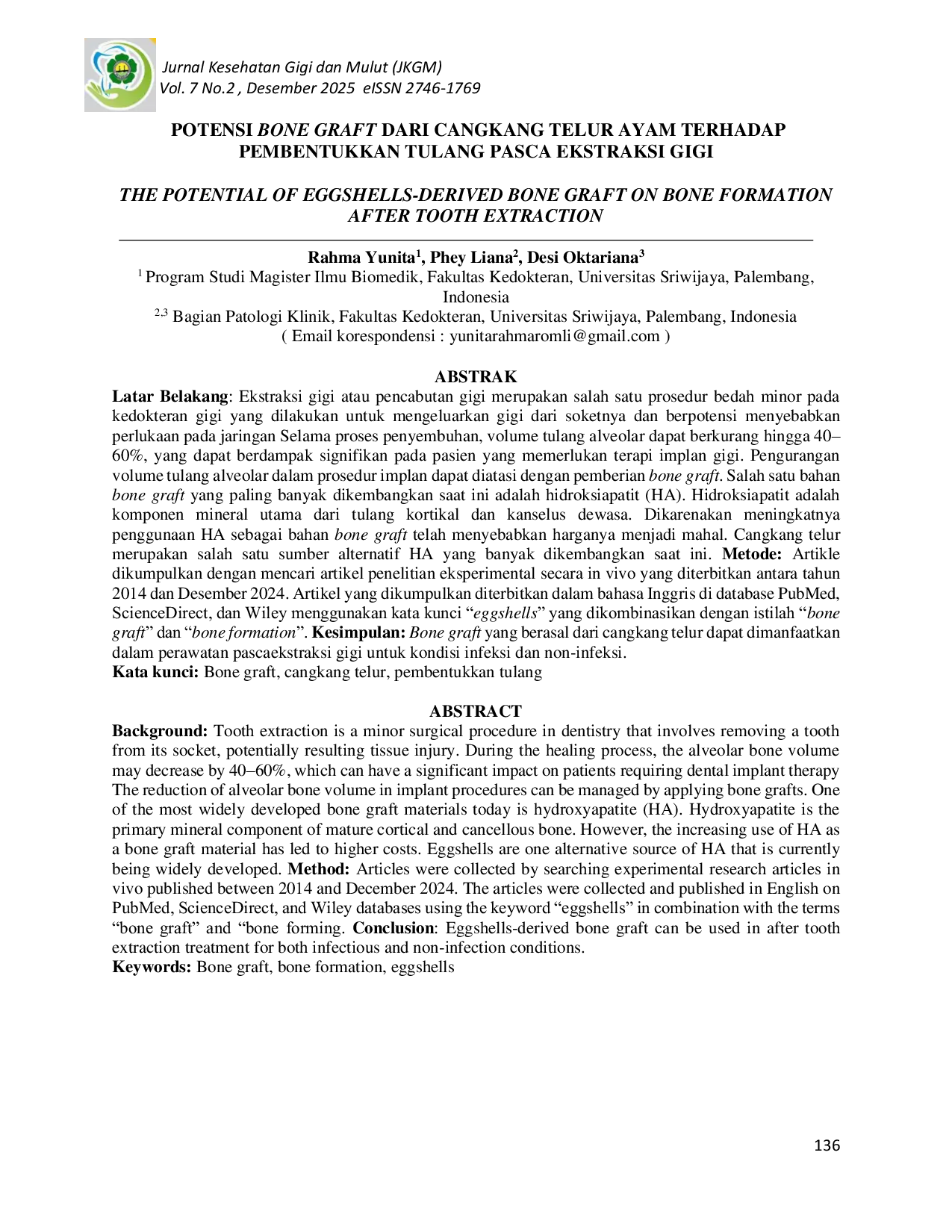 Jurnal Kesehatan Gigi dan Mulut (JKGM)Jurnal Kesehatan Gigi dan Mulut (JKGM)Latar Belakang: Ekstraksi gigi merupakan salah satu prosedur bedah minor yang berpotensi menyebabkan perlukaan pada jaringan. Selama proses penyembuhan, volume tulang alveolar dapat berkurang hingga 40–60%, yang dapat berdampak signifikan pada pasien yang memerlukan terapi implan gigi. Pengurangan volume tulang alveolar dapat diatasi dengan pemberian bone graft. Salah satu bahan bone graft yang paling banyak dikembangkan saat ini adalah hidroksiapatit (HA). Dikarenakan meningkatnya penggunaan HA sebagai bahan bone graft telah menyebabkan harganya menjadi mahal. Cangkang telur merupakan salah satu sumber alternatif HA yang banyak dikembangkan saat ini. Metode: Artikel dikumpulkan dengan mencari artikel penelitian eksperimental secara in vivo yang diterbitkan antara tahun 2014 dan Desember 2024. Artikel yang dikumpulkan diterbitkan dalam bahasa Inggris di database PubMed, ScienceDirect, dan Wiley menggunakan kata kunci “eggshells yang dikombinasikan dengan istilah “bone graft dan “bone formation. Kesimpulan: Bone graft yang berasal dari cangkang telur dapat dimanfaatkan dalam perawatan pascaekstraksi gigi untuk kondisi infeksi dan non-infeksi.