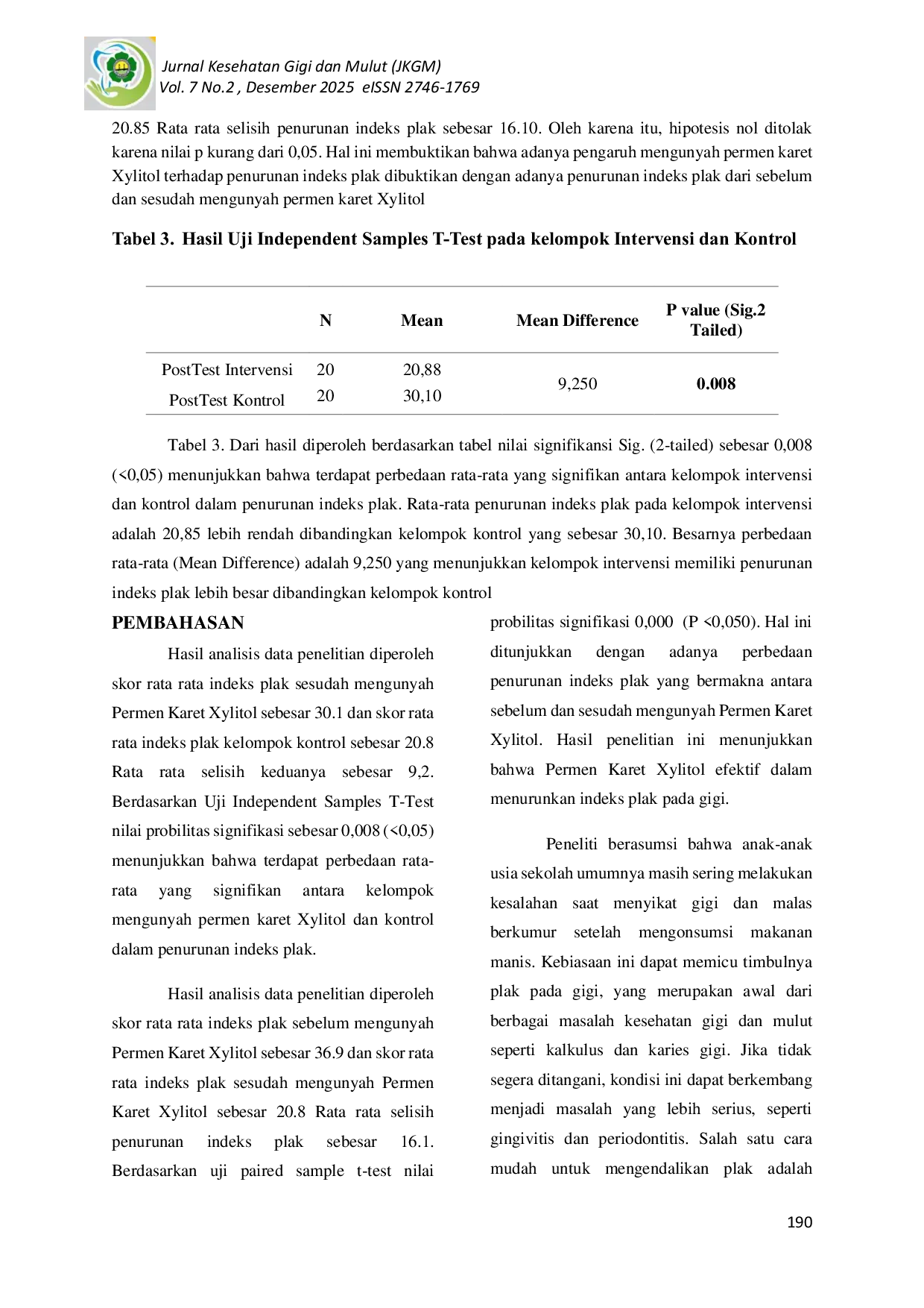 Jurnal Kesehatan Gigi dan Mulut (JKGM)Jurnal Kesehatan Gigi dan Mulut (JKGM)Masalah kesehatan gigi dan mulut masih menjadi tantangan utama di Indonesia, terutama pada anak usia sekolah dasar yang rentan terhadap karies dan plak gigi. Plak merupakan biofilm kompleks yang dapat memicu penyakit gigi jika tidak dikendalikan. Upaya pencegahan yang efektif adalah mengunyah permen karet Xylitol. Penelitian ini bertujuan untuk mengetahui adanya Pengaruh Mengunyah Permen Karet Xylitol Terhadap Penurunan Indeks Plak Pada Siswa/i di SD Negeri Gue Gajah Kabupaten Aceh Besar. Metode dalam Penelitian mengggunakan metode Quasi Experiment dengan menggunakan pretest-protest Nonequivalent Control Group Design dilakukan pada 40 Responden dibagi menjadi 2 kelompok, 20 responden kelompok intervensi dengan perlakuan mengunyah permen karet Xylitol dan 20 responden kelompok kontrol yang tidak menerima perlakuan.