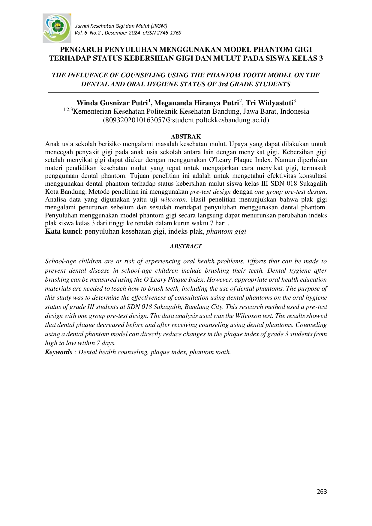 Jurnal Kesehatan Gigi dan Mulut (JKGM)Jurnal Kesehatan Gigi dan Mulut (JKGM)Anak usia sekolah berisiko mengalami masalah kesehatan mulut. Upaya yang dapat dilakukan untuk mencegah penyakit gigi pada anak usia sekolah antara lain dengan menyikat gigi. Kebersihan gigi setelah menyikat gigi dapat diukur dengan menggunakan OLeary Plaque Index. Namun, diperlukan materi pendidikan kesehatan mulut yang tepat untuk mengajarkan cara menyikat gigi, termasuk penggunaan dental phantom. Tujuan penelitian ini adalah untuk mengetahui efektivitas konsultasi menggunakan dental phantom terhadap status kebersihan mulut siswa kelas III SDN 018 Sukagalih Kota Bandung.