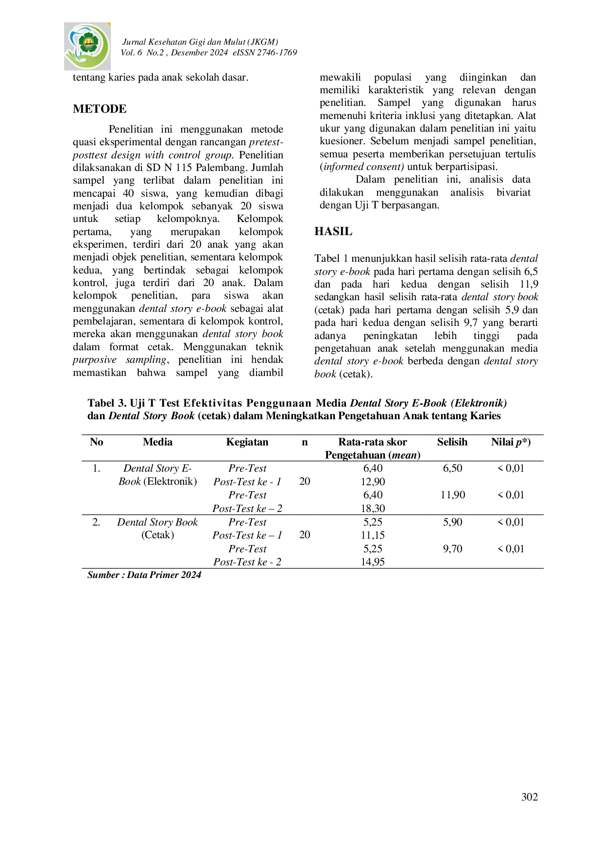 Jurnal Kesehatan Gigi dan Mulut (JKGM)Jurnal Kesehatan Gigi dan Mulut (JKGM)Latar Belakang: Karies gigi adalah penyakit yang merusak jaringan gigi, dimulai dari email, kemudian dentin, hingga mencapai pulpa. Peningkatan pengetahuan dapat membentuk perilaku yang lebih baik dan sehat. Salah satu cara meningkatkan pengetahuan adalah melalui edukasi, khususnya menggunakan teknologi digital yang digemari anak-anak. Dental story e-book adalah buku cerita digital berisi tulisan, gambar, dan warna, yang dapat dibaca melalui perangkat elektronik. Penelitian ini bertujuan untuk mengetahui Efektivitas penggunaan Dental Story E-Book terhadap peningkatan pengetahuan tentang karies pada anak sekolah dasar. Metode: Jenis penelitian ini adalah quasi eksperimental dengan desain pretest-posttest dan kelompok kontrol. Kuesioner yang digunakan sudah diuji validitas dan reliabilitas. Sampel penelitian terdiri dari 40 siswa kelas V SDN 115 Palembang yang dipilih secara purposive sampling. Uji T berpasangan. Hasil: Hasil uji T-Test menghasilkan nilai p = 0,001 (p<0,05), menunjukkan pengunaan Dental story e-book efektif yang signifikan meningkatkan pengetahuan tentang karies pada anak sekolah dasar. Kesimpulan: Penggunaan Dental Story E-Book efektif dalam meningkatkan pengetahuan tentang karies pada anak sekolah dasar.
