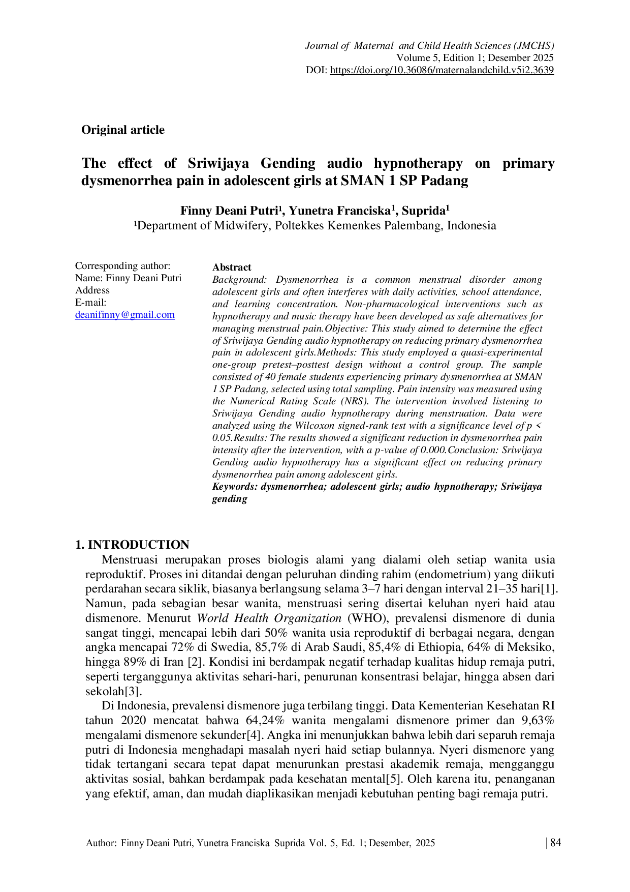 Journal of Maternal and Child Health Sciences (JMCHS)Journal of Maternal and Child Health Sciences (JMCHS)Latar Belakang: Dismenore adalah gangguan menstruasi umum pada remaja putri dan sering mengganggu aktivitas sehari-hari, kehadiran di sekolah, dan konsentrasi belajar. Intervensi non-farmakologis seperti hipnoterapi dan terapi musik telah dikembangkan sebagai alternatif yang aman untuk mengatasi nyeri menstruasi. Tujuan: Penelitian ini bertujuan untuk menentukan pengaruh audio hipnoterapi Sriwijaya Gending terhadap penurunan nyeri dismenore primer pada remaja putri. Metode: Penelitian ini menggunakan desain kuasi-eksperimen one-group pretest-posttest tanpa kelompok kontrol. Sampel terdiri dari 40 siswi yang mengalami dismenore primer di SMAN 1 SP Padang, yang dipilih menggunakan total sampling. Intensitas nyeri diukur menggunakan Numerical Rating Scale (NRS). Intervensi melibatkan mendengarkan audio hipnoterapi Sriwijaya Gending selama menstruasi. Data dianalisis menggunakan uji Wilcoxon signed-rank test dengan tingkat signifikansi p < 0,05. Hasil: Hasil penelitian menunjukkan penurunan signifikan intensitas nyeri dismenore setelah intervensi, dengan nilai p 0,000. Kesimpulan: Audio hipnoterapi Sriwijaya Gending memiliki pengaruh signifikan terhadap penurunan nyeri dismenore primer pada remaja putri.