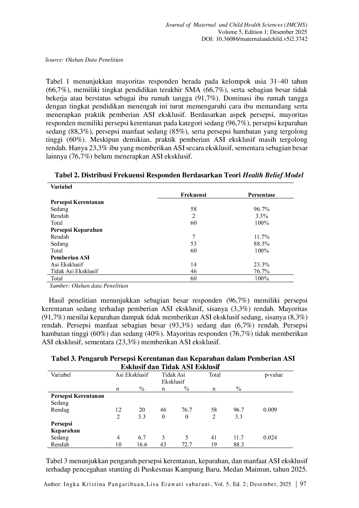 Hasil penelitian menunjukkan bahwa persepsi ibu yang dibangun berdasarkan kerangka Health Belief Model (HBM) memiliki pengaruh yang bermakna terhadap praktik pemberian ASI eksklusif sebagai salah satu upaya pencegahan stunting di wilayah kerja Puskesmas Kampung Baru, Kota Medan.Dimensi persepsi ibu yang meliputi kerentanan, tingkat keparahan, serta manfaat terbukti berhubungan secara signifikan secara statistik dengan pelaksanaan ASI eksklusif (p < 0,05).Ibu yang memiliki persepsi kerentanan pada tingkat sedang cenderung lebih konsisten dalam menerapkan pemberian ASI eksklusif.Temuan ini mengindikasikan bahwa peningkatan pemahaman dan pembentukan keyakinan ibu melalui edukasi kesehatan yang sistematis dan berkelanjutan berperan penting dalam meningkatkan cakupan ASI eksklusif serta mendukung pencegahan stunting.