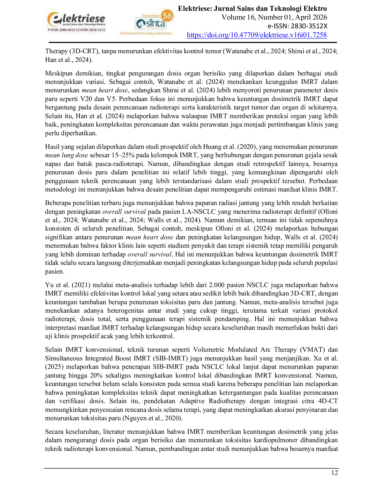 Elektriese: Jurnal Sains dan Teknologi ElektroElektriese: Jurnal Sains dan Teknologi ElektroKanker paru-paru merupakan salah satu penyebab utama kematian akibat kanker di seluruh dunia, dengan angka mortalitas yang terus meningkat setiap tahun. Di Indonesia, prevalensi kanker paru-paru juga mengalami peningkatan, terutama pada kelompok usia lanjut dan perokok aktif maupun pasif. Radioterapi merupakan salah satu modalitas utama dalam penatalaksanaan kanker paru-paru, khususnya bagi pasien yang tidak dapat menjalani pembedahan. Seiring kemajuan teknologi, metode Intensity Modulated Radiation Therapy (IMRT) dikembangkan untuk meningkatkan presisi pemberian dosis radiasi dengan tetap melindungi jaringan sehat di sekitar tumor. Penelitian ini bertujuan untuk meninjau secara sistematis literatur terkini mengenai efektivitas dan keamanan Intensity-Modulated Radiotherapy (IMRT) dibandingkan teknik konvensional seperti Three-Dimensional Conformal Radiotherapy (3D-CRT). Metode yang digunakan adalah Systematic Literature Review (SLR) dengan mengikuti pedoman PRISMA 2020 terhadap artikel internasional yang diterbitkan dalam lima tahun terakhir (2019–2024). Hasil Penelitian menunjukkan bahwa IMRT mampu menurunkan dosis radiasi pada organ vital seperti jantung, paru-paru, spinalis, kontralateral, dan medula kardiopulmoner tanpa mengurangi efektivitas pengendalian tumor. Teknik turunan IMRT seperti Volumetric Modulated Arc Therapy (VMAT) dan Simultaneous Integrated Boost (SIB-IMRT) terbukti meningkatkan akurasi penyinaran serta kualitas hidup pasien. IMRT merupakan inovasi penting dalam bidang onkologi radiasi yang efektif, aman, dan berpotensi menjadi standar utama dalam tata laksana radioterapi kanker paru-paru di masa depan.