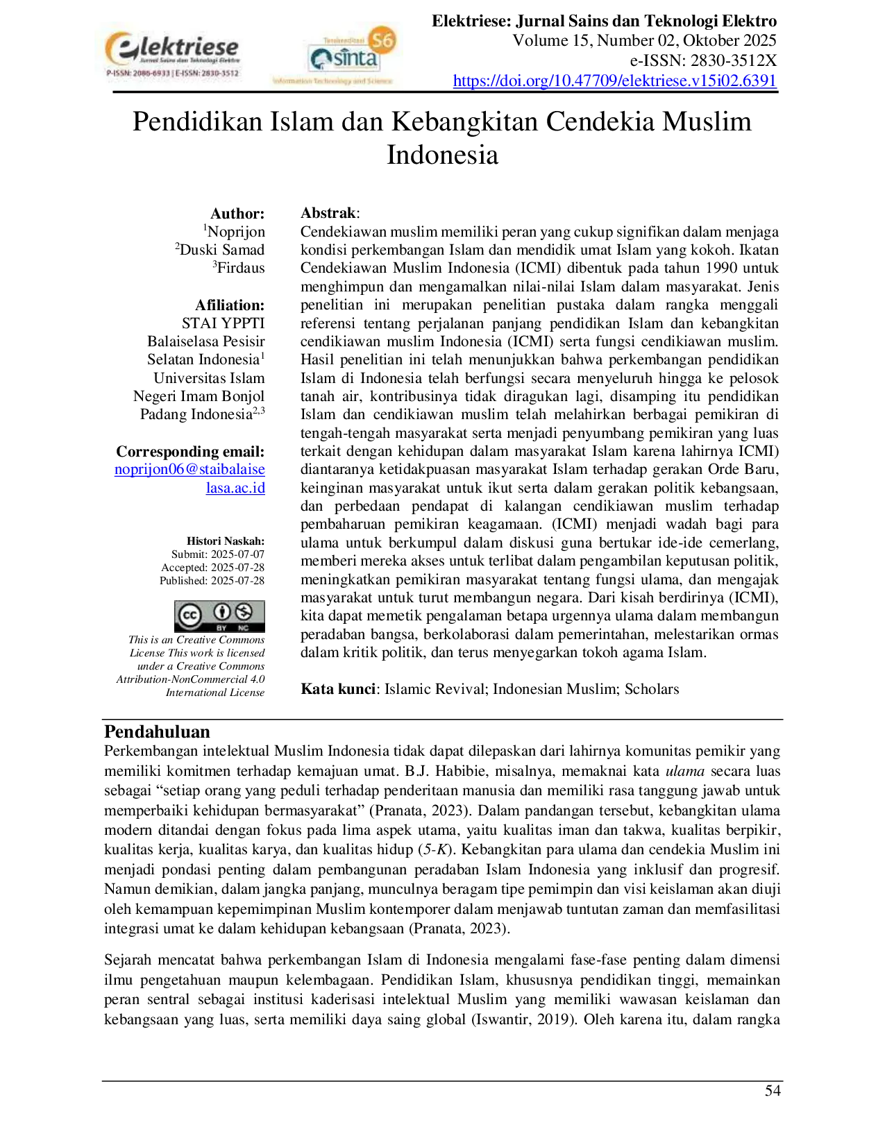 Elektriese: Jurnal Sains dan Teknologi ElektroElektriese: Jurnal Sains dan Teknologi ElektroCendekiawan muslim memiliki peran yang cukup signifikan dalam menjaga kondisi perkembangan Islam dan mendidik umat Islam yang kokoh. Ikatan Cendekiawan Muslim Indonesia (ICMI) dibentuk pada tahun 1990 untuk menghimpun dan mengamalkan nilai-nilai Islam dalam masyarakat. Penelitian ini merupakan penelitian pustaka dalam rangka menggali referensi tentang perjalanan panjang pendidikan Islam dan kebangkitan cendikiawan muslim Indonesia (ICMI) serta fungsi cendikiawan muslim. Hasil penelitian ini telah menunjukkan bahwa perkembangan pendidikan Islam di Indonesia telah berfungsi secara menyeluruh hingga ke pelosok tanah air, kontribusinya tidak diragukan lagi, disamping itu pendidikan Islam dan cendikiawan muslim telah melahirkan berbagai pemikiran di tengah-tengah masyarakat serta menjadi penyumbang pemikiran yang luas terkait dengan kehidupan dalam masyarakat Islam karena lahirnya ICMI) diantaranya ketidakpuasan masyarakat Islam terhadap gerakan Orde Baru, keinginan masyarakat untuk ikut serta dalam gerakan politik kebangsaan, dan perbedaan pendapat di kalangan cendekiawan muslim terhadap pembaharuan pemikiran keagamaan. (ICMI) menjadi wadah bagi para ulama untuk berkumpul dalam diskusi guna bertukar ide-ide cemerlang, memberi mereka akses untuk terlibat dalam pengambilan keputusan politik, meningkatkan pemikiran masyarakat tentang fungsi ulama, dan mengajak masyarakat untuk turut membangun negara. Dari kisah berdirinya (ICMI), kita dapat memetik pengalaman betapa urgennya ulama dalam membangun peradaban bangsa, berkolaborasi dalam pemerintahan, melestarikan ormas dalam kritik politik, dan terus menyegarkan tokoh agama Islam.