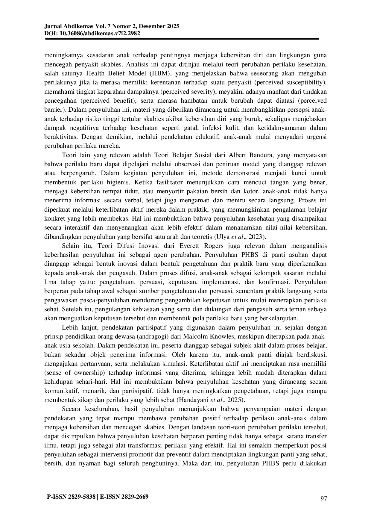 Pertama, perlu dilakukan penelitian tentang efektivitas model penyuluhan berbasis permainan edukatif jangka panjang terhadap pemahaman dan keberlanjutan perilaku PHBS pada anak panti asuhan, untuk mengetahui apakah metode ini lebih unggul dalam membangun kebiasaan sehat dibanding metode konvensional. Kedua, penting untuk mengevaluasi pengaruh keterlibatan pengasuh sebagai pelatih sebaya dalam memperkuat penerapan PHBS, dengan meneliti bagaimana dinamika sosial di panti memengaruhi adopsi perilaku bersih secara berkelanjutan. Ketiga, perlu dikaji penerapan sistem reward sederhana di panti asuhan untuk mendorong konsistensi anak dalam menerapkan PHBS, serta mengeksplorasi bagaimana insentif non-materi dapat memperkuat motivasi internal anak dalam menjaga kebersihan diri dan lingkungan, sehingga pencegahan skabies menjadi bagian dari budaya harian panti.
