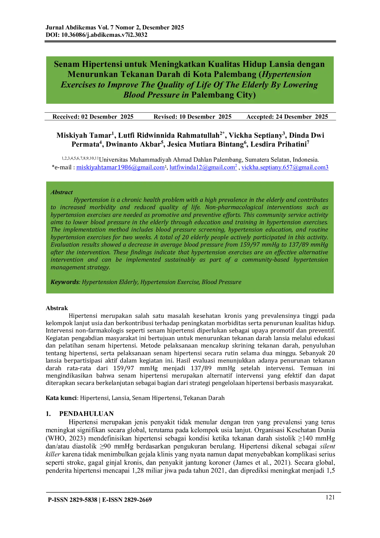 Jurnal Pengabdian kepada Masyarakat (ABDIKEMAS)Jurnal Pengabdian kepada Masyarakat (ABDIKEMAS)Hipertensi merupakan masalah kesehatan kronis dengan prevalensi tinggi pada kelompok lanjut usia dan berkontribusi terhadap peningkatan morbiditas serta penurunan kualitas hidup. Intervensi non-farmakologis seperti senam hipertensi diperlukan sebagai upaya promotif dan preventif. Kegiatan pengabdian masyarakat ini bertujuan untuk menurunkan tekanan darah lansia melalui edukasi dan pelatihan senam hipertensi. Metode pelaksanaan mencakup skrining tekanan darah, penyuluhan tentang hipertensi, serta pelaksanaan senam hipertensi secara rutin selama dua minggu. Sebanyak 20 lansia berpartisipasi aktif dalam kegiatan ini. Hasil evaluasi menunjukkan adanya penurunan tekanan darah rata-rata dari 159/97 mmHg menjadi 137/89 mmHg setelah intervensi, mengindikasikan bahwa senam hipertensi merupakan alternatif intervensi yang efektif dan dapat diterapkan secara berkelanjutan sebagai bagian dari strategi pengelolaan hipertensi berbasis masyarakat.