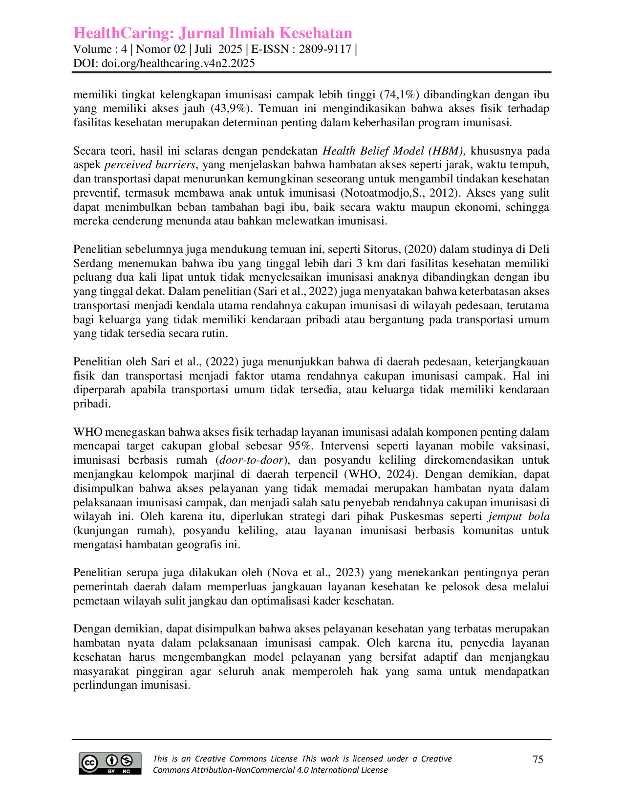 Healthcaring: Jurnal Ilmiah KesehatanHealthcaring: Jurnal Ilmiah KesehatanImunisasi campak merupakan bagian penting dari imunisasi dasar untuk anak usia 9–24 bulan. Namun, cakupan imunisasi campak di wilayah Puskesmas Batu Anam masih rendah. Berbagai faktor dapat memengaruhi pelaksanaan imunisasi, antara lain akses terhadap pelayanan kesehatan dan dukungan keluarga. Penelitian ini bertujuan untuk menganalisis hubungan antara akses pelayanan dan dukungan keluarga terhadap pelaksanaan imunisasi campak di Puskesmas Batu Anam, Provinsi Sumatera Utara tahun 2025. Metode Penelitian kuantitatif ini menggunakan desain cross-sectional dengan jumlah sampel sebanyak 68 responden, dipilih menggunakan teknik proportional random sampling. Data dikumpulkan melalui kuesioner dan dianalisis menggunakan uji chi-square dengan tingkat signifikansi p<0,05. Hasil menunjukkan bahwa akses pelayanan dan dukungan keluarga memiliki hubungan yang signifikan dengan cakupan imunisasi campak (masing-masing p=0,014 dan p=0,022). Responden dengan akses pelayanan yang dekat (<5 km) dan dukungan keluarga yang baik memiliki cakupan imunisasi yang lebih tinggi. Kesimpulan penelitian adalah rendahnya cakupan imunisasi campak berkaitan erat dengan hambatan akses dan kurangnya dukungan keluarga. Intervensi yang melibatkan keluarga dan peningkatan layanan imunisasi berbasis masyarakat direkomendasikan untuk meningkatkan cakupan imunisasi.