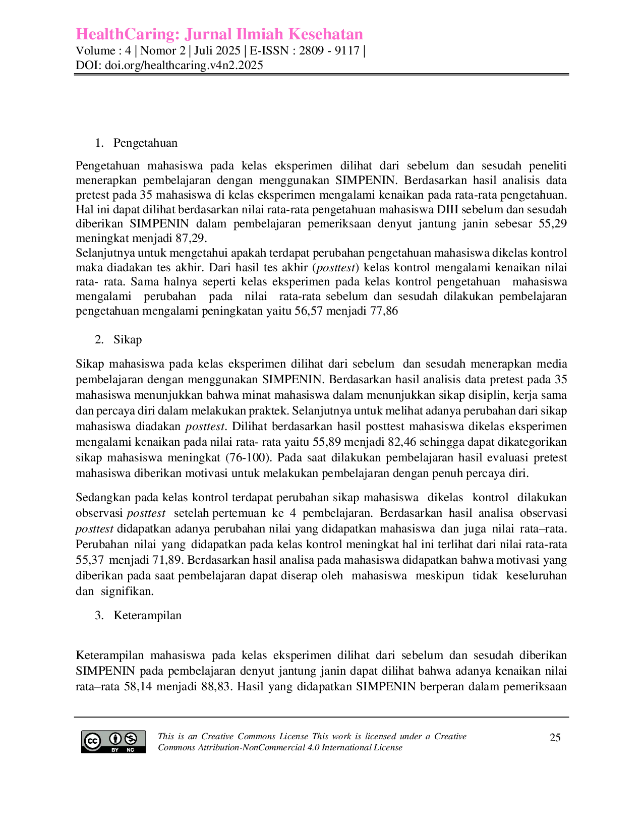 Healthcaring: Jurnal Ilmiah KesehatanHealthcaring: Jurnal Ilmiah KesehatanPemeriksaan Denyut Jantung Janin merupakan salah satu kompetensi penting yang harus dikuasai oleh bidan dalam memberikan pelayanan kesehatan maternal dan neonatal. Keterampilan ini tidak hanya bersifat teknis, tetapi juga membutuhkan pemahaman teoritis serta sikap profesional dalam menghadapi ibu hamil. Penelitian ini bertujuan untuk menganalisis efektivitas penggunaan SIMPENIN terhadap peningkatan pengetahuan, sikap, dan keterampilan mahasiswa D3 Kebidanan semester II dan IV di Sekolah Tinggi Ilmu Kesehatan Cianjur. Penelitian ini menggunakan metode kuantitatif dengan desain quasi-experimental nonequivalent control group design. Populasi penelitian sebanyak 70 mahasiswa yang dibagi dalam kelompok eksperimen (menggunakan SIMPENIN) dan kelompok kontrol (menggunakan metode konvensional dengan phantom palpasi abdomen). Analisis data menggunakan uji Independent T-Test melalui SPSS. Hasil penelitian menunjukkan bahwa terdapat peningkatan pengetahuan pada kelompok intervensi dari 55,29 menjadi 87,29, sikap dari 55,89 menjadi 82,46 dan keterampilan dari 58,14 menjadi 88,83 lebih tinggi dari kelompok kontrol dimana pengetahuan dari 56,57 menjadi 77,86, sikap dari 55,37 menjadi 71,89, keterampilan dari 58,29 menjadi 66,31. Berdasarkan analisis independent t-test menunjukkan signifikan pada pengetahuan, sikap dan keterampilan (p < 0,05). Penggunaan SIMPENIN dapat menjadi alternatif pembelajaran yang efektif dan aplikatif dalam pendidikan kebidanan. Media ini membantu mahasiswa lebih percaya diri dan siap menghadapi praktik antenatal care. Pengembangan media simulator lain perlu dilakukan untuk mendukung terciptanya bidan yang profesional, terampil, dan kompetitif.