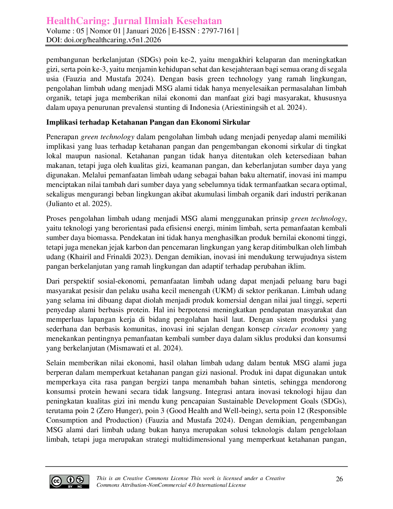 Healthcaring: Jurnal Ilmiah KesehatanHealthcaring: Jurnal Ilmiah KesehatanPemanfaatan limbah udang sebagai bahan baku penyedap rasa alami (Monosodium Glutamate alami) merupakan inovasi yang selaras dengan prinsip green technology dan berpotensi mendukung upaya pencegahan stunting. Limbah udang mengandung protein dan mineral tinggi yang dapat diolah menjadi penyedap alami bergizi. Penelitian ini bertujuan menganalisis penerapan green technology pada proses produksi MSG alami dari limbah udang serta mengkaji nilai gizinya yang berkontribusi terhadap pencegahan stunting. Metode penelitian menggunakan pendekatan eksperimental dengan True Experimental Design laboratorium dengan metode pengeringan termal menggunakan oven. Hasil uji menunjukkan bahwa bubuk MSG alami memiliki kadar protein 49,05%, kadar lemak 3,21%, kadar air 5,55%, kadar abu 22,82%, karbohidrat total 19,37%, dan natrium 1991 mg/kg dengan energi total 300 kkal/100 g. Kandungan protein dan mineral yang tinggi serta natrium dalam batas aman menjadikan produk ini potensial sebagai penyedap rasa alami yang aman dan bergizi. Implementasi green technology terbukti efisien dalam meminimalkan limbah perikanan serta menghasilkan produk fungsional yang mendukung peningkatan gizi masyarakat, khususnya anak-anak berisiko stunting.