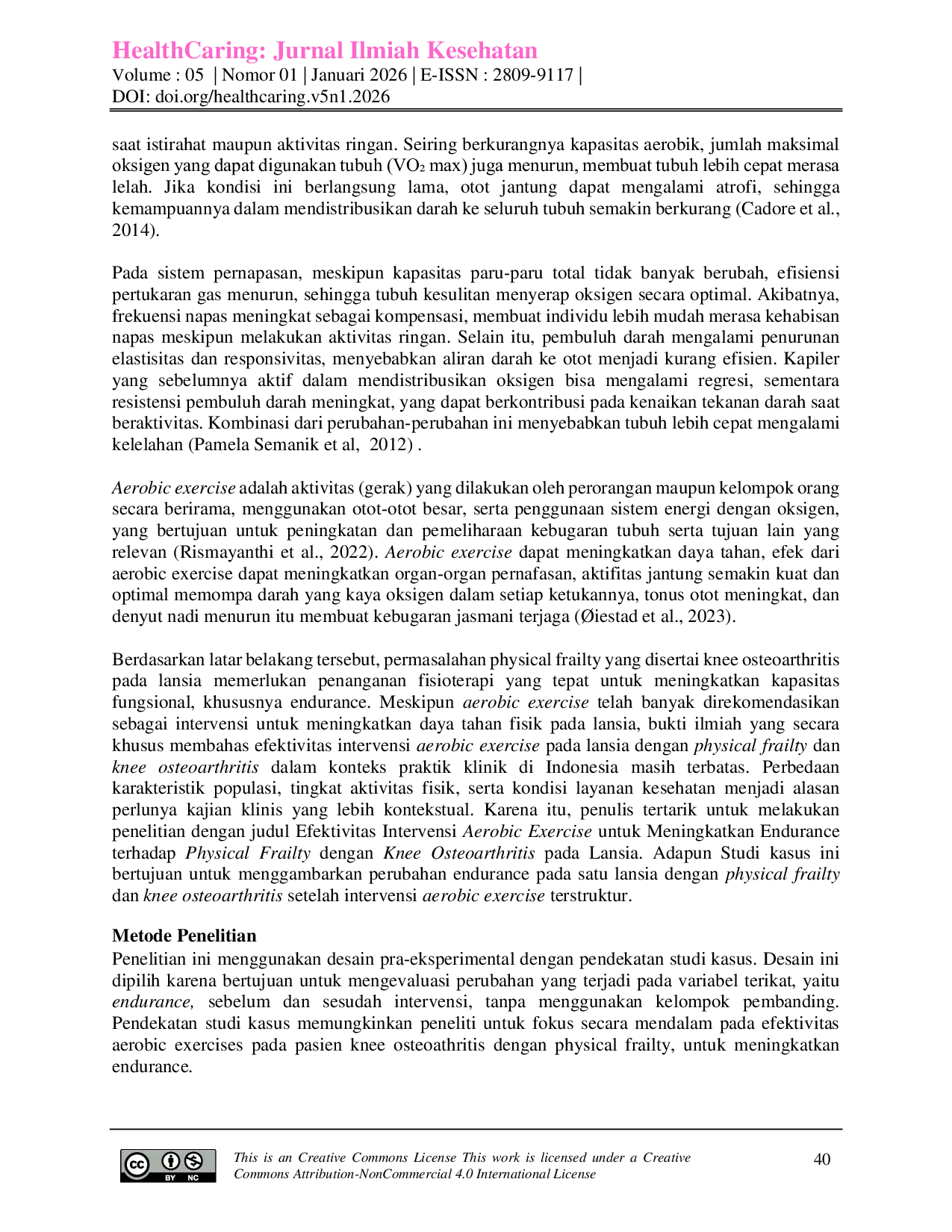 Healthcaring: Jurnal Ilmiah KesehatanHealthcaring: Jurnal Ilmiah KesehatanPhysical frailty adalah kondisi yang ditandai dengan menurunnya cadangan fisiologis tubuh, termasuk kelemahan otot, penurunan endurance, lambatnya kecepatan berjalan, penurunan aktivitas fisik, dan penurunan berat badan yang tidak disengaja. Knee Osteoarthritis merupakan penyakit degeneratif yang paling umum terjadi pada lansia. Keterbatasan gerak sendi, nyeri kronis, dan penurunan kekuatan otot akibat knee osteoarthritis menyebabkan lansia mengurangi aktivitas fisik, yang pada akhirnya berdampak pada penurunan endurance kardiovaskular dan respirasi. Penurunan endurance tersebut ditandai dengan merasa cepat lelah saat melakukan aktivitas, sehingga membuat lansia semakin rentan terhadap gangguan fungsional dan penurunan kualitas hidup. Salah satu upaya untuk meningkatkan endurance adalah dengan pemberian intervensi aerobic exercise. Tujuan penelitian ini adalah untuk mengetahui peningkatan endurance setelah diberikan intervensi aerobic exercise selama dua kali seminggu dalam enam minggu. Metode yang digunakan adalah studi kasus. Pengukuran yang digunakan dalam penelitian ini adalah 2 Minute Step Test (2MST) dengan hasil E1=57, E2=62, dan E3=68. Hasil akhir pengukuran endurance didapatkan skor 68. Kesimpulan dari penelitian ini adalah bahwa pemberian aerobic exercise efektif untuk meningkatkan endurance pada lansia dengan physical frailty akibat knee osteoarthritis.