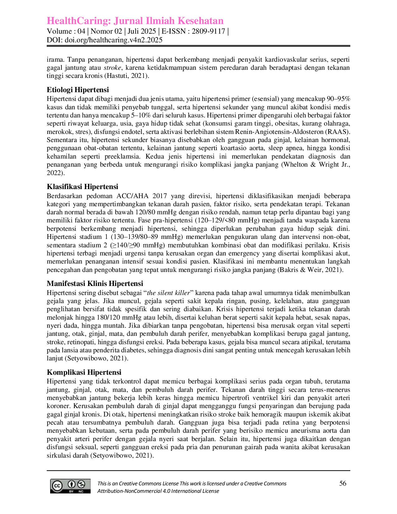 Berdasarkan hasil penelitian, terdapat beberapa saran penelitian lanjutan yang dapat dikembangkan untuk memperdalam pemahaman mengenai faktor-faktor yang memengaruhi kejadian hipertensi di wilayah perkotaan. Pertama, penelitian kuantitatif dengan desain kohort dapat dilakukan untuk mengidentifikasi secara longitudinal bagaimana perubahan gaya hidup, seperti pola makan dan tingkat aktivitas fisik, berkontribusi terhadap perkembangan hipertensi pada populasi dewasa muda. Kedua, penelitian kualitatif dengan pendekatan fenomenologi dapat digunakan untuk mengeksplorasi secara mendalam persepsi dan pengalaman masyarakat terkait dengan pencegahan hipertensi, termasuk hambatan dan fasilitator yang memengaruhi perilaku mereka. Ketiga, penelitian intervensi komunitas yang melibatkan program edukasi dan promosi kesehatan terpadu dapat diimplementasikan untuk menguji efektivitas strategi pencegahan hipertensi berbasis masyarakat dalam meningkatkan kesadaran, mengubah perilaku, dan mengurangi risiko kejadian hipertensi. Kombinasi dari ketiga pendekatan ini diharapkan dapat memberikan gambaran yang lebih komprehensif mengenai dinamika hipertensi dan menginformasikan pengembangan program pencegahan yang lebih efektif dan berkelanjutan.